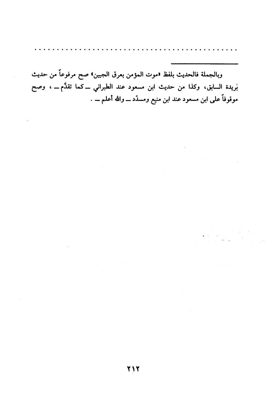 = وبالجملة فالحديث بلفظ "موت المؤمن بعرق الجبين" صح مرفوعًا من حديث بريدة السابق، وكذا من حديث ابن مسعود عند الطبراني -وما تقدَّم-، وصح موقوفًا على ابن مسعود عند ابن منيع ومسدّد -والله أعلم-.