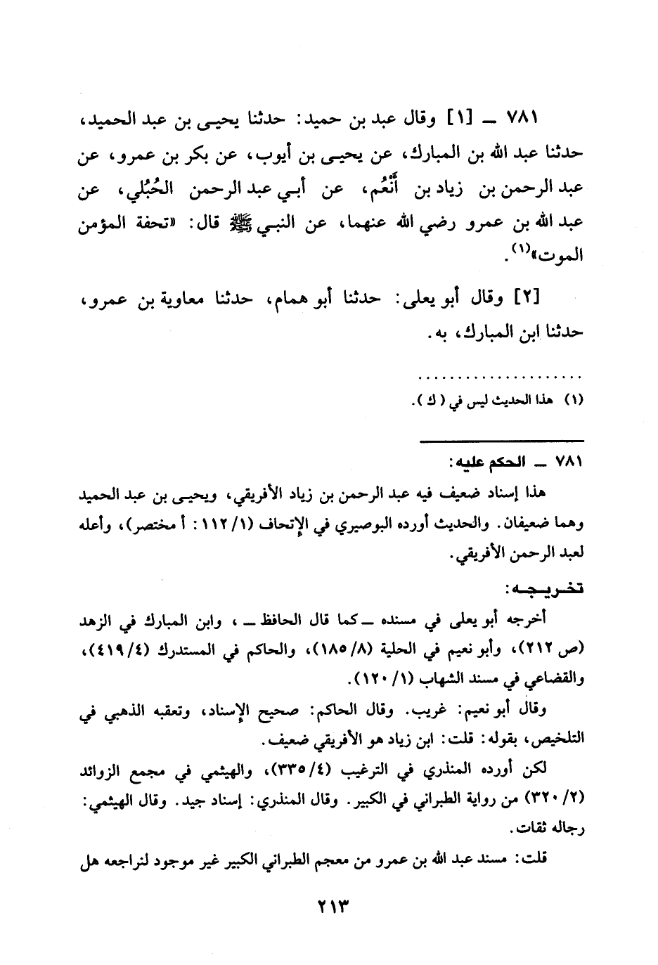 حَدَّثَنَا يَحْيَى بْنُ عَبْدِ الْحَمِيدِ حَدَّثَنَا عَبْدُ اللَّهِ بْنُ الْمُبَارَكِ عَنْ يَحْيَى بْنِ أَيُّوبَ عَنْ بَكْرِ بْنِ عَمْرٍو عَنْ عَبْدِ الرَّحْمَنِ بْنِ زِيَادِ بْنِ أَنْعَمَ عَنْ أَبِي عَبْدِ الرَّحْمَنِ الْحُبُلِيِّ عَنْ عَبْدِ اللَّهِ بْنِ عَمْرٍو رَضِيَ الله عَنْهُمَا عَنِ النَّبِيِّ صَلَّى اللَّهُ عَلَيْهِ وَسَلَّمَ قَالَ §تُحْفَةُ الْمُؤْمِنِ الْمَوْتُ وَقَالَ أَبُو يَعْلَى حَدَّثَنَا أَبُو هَمَّامٍ حَدَّثَنَا مُعَاوِيَةُ بْنُ عَمْرٍو حَدَّثَنَا ابْنُ الْمُبَارَكِ بِهِ