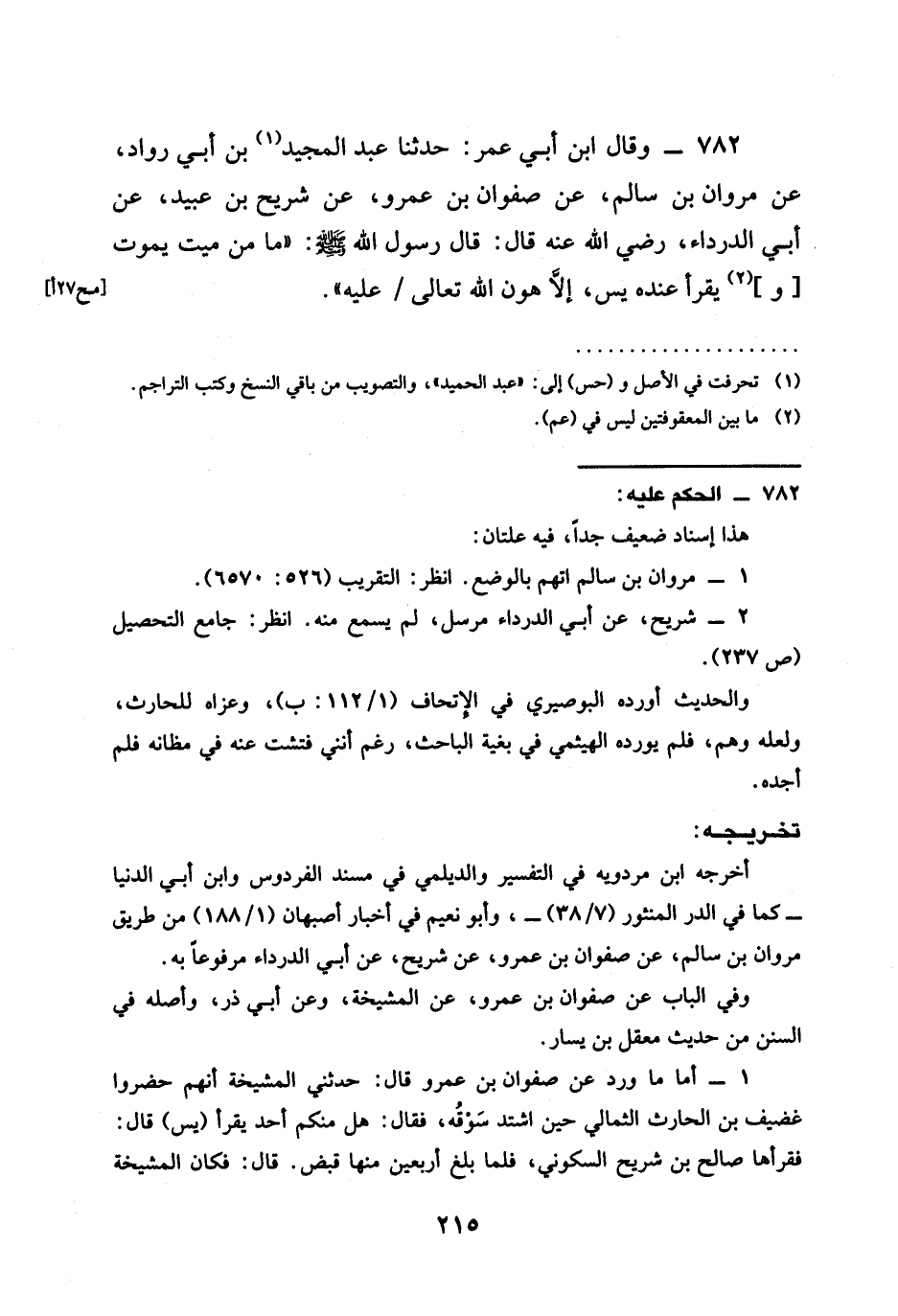 782 - وَقَالَ ابْنُ أَبِي عُمَرَ حَدَّثَنَا عَبْدُ الْمَجِيدِ بْنُ أَبِي رَوَّادٍ عَنْ مَرْوَانَ بْنِ سَالِمٍ عَنْ صَفْوَانَ بْنِ عَمْرٍو عَنْ شُرَيْحِ بْنِ عُبَيْدٍ عَنْ أَبِي الدَّرْدَاءِ رَضِيَ الله عَنْهُ قَالَ قَالَ رَسُولُ اللَّهِ صَلَّى اللَّهُ عَلَيْهِ وَسَلَّمَ §مَا مِنْ مَيِّتٍ يَمُوتُ وَيُقْرَأُ عِنْدَهُ يس إِلَّا هَوَّنَ اللَّهُ تَعَالَى عَلَيْهِ