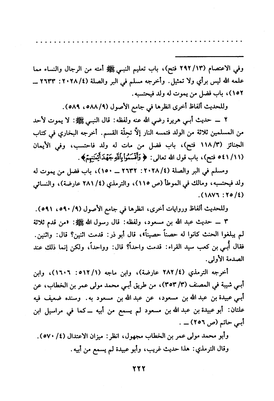 ومسلم في البر والصلة (4/ 2028: 2632 - 150)، باب فضل من يموت له ولد فيحتسبه، ومالك في الموطأ (ص 115)، والترمذي (4/ 281 عارضة)، والنسائي (4/ 25: 1876).
