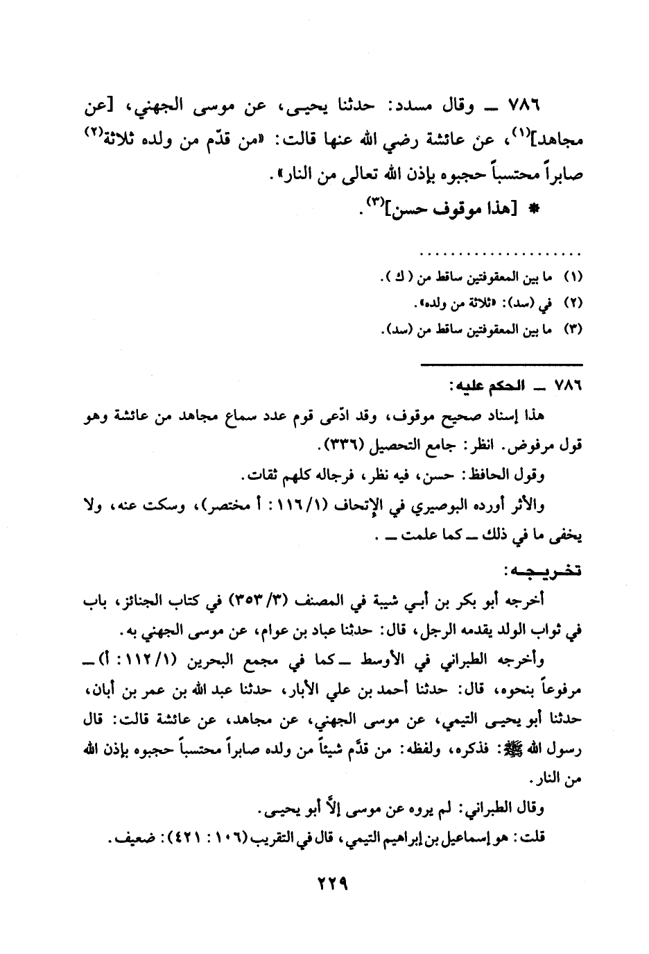 786 - وَقَالَ مُسَدَّدٌ حَدَّثَنَا يَحْيَى عَنْ مُوسَى الْجُهَنِيِّ عَنْ مُجَاهِدٍ عَنْ عَائِشَةَ رَضِيَ الله عَنْهَا قَالَتْ §مَنْ قَدَّمَ مِنْ وَلَدِهِ ثَلَاثَةً صَابِرًا مُحْتَسِبًا حَجَبُوهُ بِإِذْنِ اللَّهِ تَعَالَى مِنَ النَّارِ