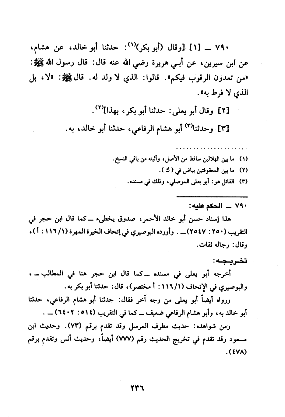 حَدَّثَنَا أَبُو خَالِدٍ عَنْ هِشَامٍ عَنِ ابْنِ سِيرِينَ عَنْ أَبِي هُرَيْرَةَ رَضِيَ الله عَنْهُ قَالَ قَالَ رَسُولُ اللَّهِ صَلَّى اللَّهُ عَلَيْهِ وَسَلَّمَ §مَنْ تَعُدُّونَ الرَّقُوبَ فيكم قالوا ذالذي لَا وَلَدَ لَهُ قَالَ صَلَّى اللَّهُ عَلَيْهِ وَسَلَّمَ لَا بَلِ الَّذِي لَا فَرَطَ بِهِ وَقَالَ أَبُو يَعْلَى حَدَّثَنَا أَبُو بَكْرٍ بِهَذَا وَحَدَّثَنَا أَبُو هِشَامٍ الرِّفَاعِيُّ حَدَّثَنَا أَبُو خَالِدٍ بِهِ