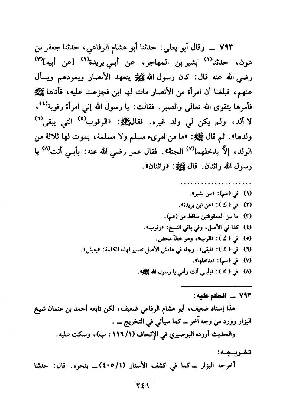 حَدَّثنا أَبُو هِشَامٍ الرِّفَاعِيُّ حَدَّثنا جَعْفَرُ بْنُ عَوْنٍ حَدَّثنا بَشِيرُ بْنُ المهاجر عن أبي بُرَيْدَةَ عَنْ أَبِيهِ رَضِيَ الله عَنْهُ قَالَ كَانَ رَسُولُ اللَّهِ صَلَّى اللَّهُ عَلَيْهِ وَسَلَّمَ يَتَعَهَّدُ الْأَنْصَارَ وَيَعُودُهُمْ وَيَسْأَلُ عَنْهُمْ فَبَلَغَنَا أَنَّ امْرَأَةً مِنَ النصار مَاتَ لَهَا ابْنٌ فَجَزِعَتْ عَلَيْهِ فَأَتَاهَا صَلَّى اللَّهُ عَلَيْهِ وَسَلَّمَ فَأَمَرَهَا بِتَقْوَى اللَّهِ تَعَالَى وَالصَّبْرِ فَقَالَتْ يَا رَسُولَ اللَّهِ إِنِّي امْرَأَةٌ رَقُوبَةٌ لَا أَلِدُ وَلَمْ يَكُنْ لِي وَلَدٌ غَيْرَهُ فَقَالَ صَلَّى اللَّهُ عَلَيْهِ وَسَلَّمَ الرَّقُوبُ الَّتِي يَبْقَى وَلَدُهَا ثُمَّ قَالَ صَلَّى اللَّهُ عَلَيْهِ وَسَلَّمَ §مَا مِنِ امْرِئٍ مُسْلِمٍ وَلَا مُسْلِمَةٍ يَمُوتُ لَهَا ثَلَاثَةٌ مِنَ الْوَلَدِ إِلَّا يُدْخِلُهُمَا الْجَنَّةَ فَقَالَ عُمَرُ رَضِيَ الله عَنْهُ بِأَبِي أَنْتَ يَا رَسُولَ اللَّهِ وثنان قَالَ صَلَّى اللَّهُ عَلَيْهِ وَسَلَّمَ وَاثْنَانِ