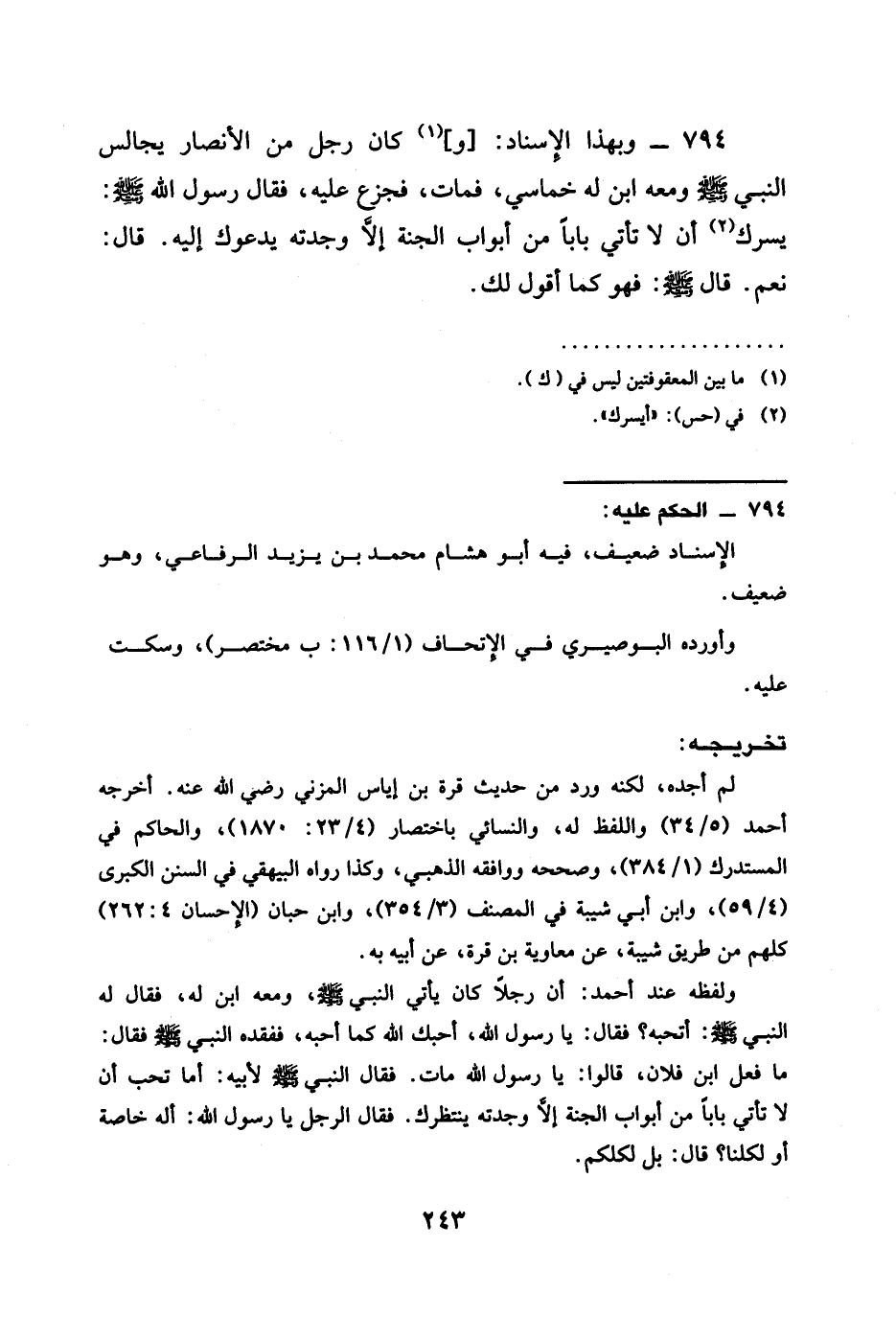 794 - وَبِهَذَا الْإِسْنَادِ وَكَانَ رَجُلٌ مِنَ الْأَنْصَارِ يُجَالِسُ النَّبِيَّ صَلَّى اللَّهُ عَلَيْهِ وَسَلَّمَ وَمَعَهُ ابْنٌ لَهُ خُمَاسِيٌّ فَمَاتَ فَجَزِعَ عَلَيْهِ فَقَالَ رَسُولُ اللَّهِ صَلَّى اللَّهُ عَلَيْهِ وَسَلَّمَ §يَسُرُّكَ أَنْ لَا تَأْتِيَ بَابًا مِنْ أَبْوَابِ الْجَنَّةِ إِلَّا وَجَدْتَهُ يَدْعُوكَ إِلَيْهِ قَالَ نَعَمْ قَالَ صَلَّى اللَّهُ عَلَيْهِ وَسَلَّمَ فَهُوَ كَمَا أَقُولُ لَكَ