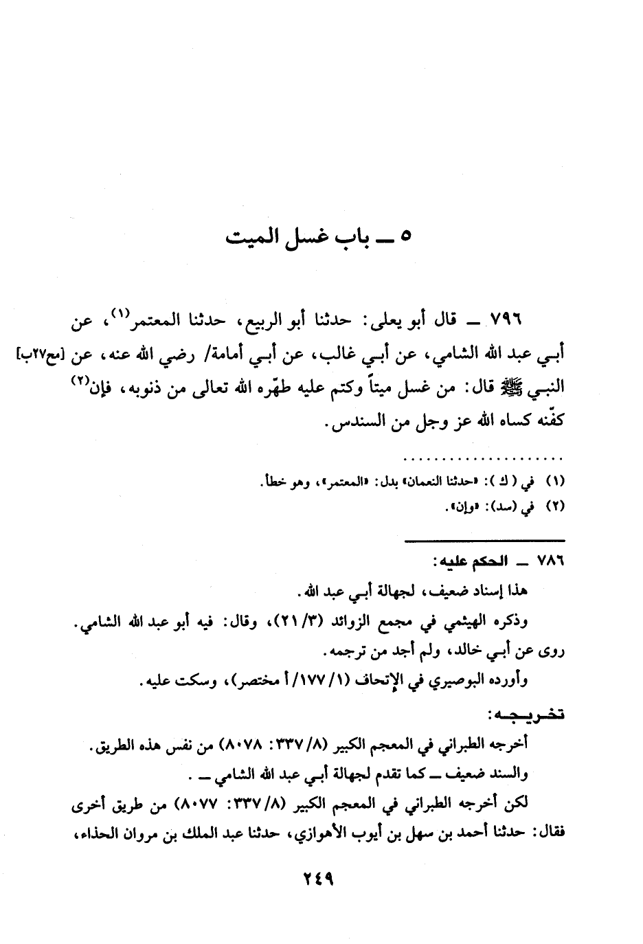 حَدَّثَنَا أَبُو الرَّبِيعِ حَدَّثنا الْمُعْتَمِرُ عَنْ أَبِي عَبْدِ اللَّهِ الشَّامِيِّ عَنْ أَبِي غَالِبٍ عَنْ أَبِي أُمَامَةَ رَضِيَ الله عَنْهُ عَنِ النَّبِيِّ صَلَّى اللَّهُ عَلَيْهِ وَسَلَّمَ قَالَ §مَنْ غَسَّلَ مَيِّتًا وَكَتَمَ عَلَيْهِ طَهَّرَهُ اللَّهُ تَعَالَى مِنْ ذُنُوبِهِ فَإِنْ كَفَّنَهُ كَسَاهُ اللَّهُ عَزَّ وَجَلَّ مِنَ السُّنْدُسِ