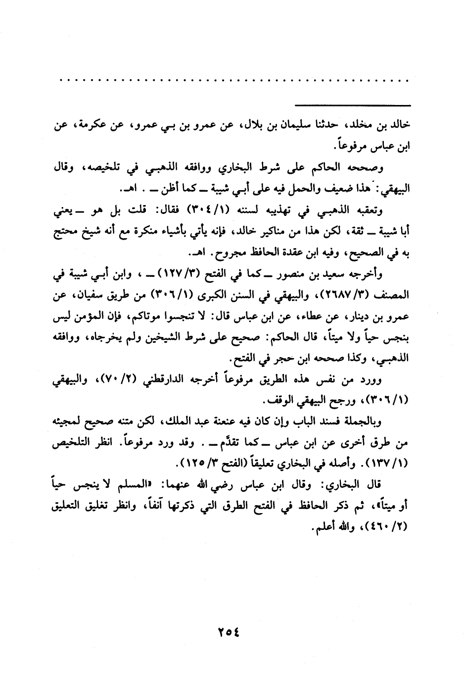 قال البخاري: وقال ابن عباس رضي الله عنهما: "المسلم لا ينجس حيًا أو ميتًا"، ثم ذكر الحافظ في الفتح الطرق التي ذكرتها آنفًا، وانظر تغليق التعليق (2/ 460)، والله أعلم.