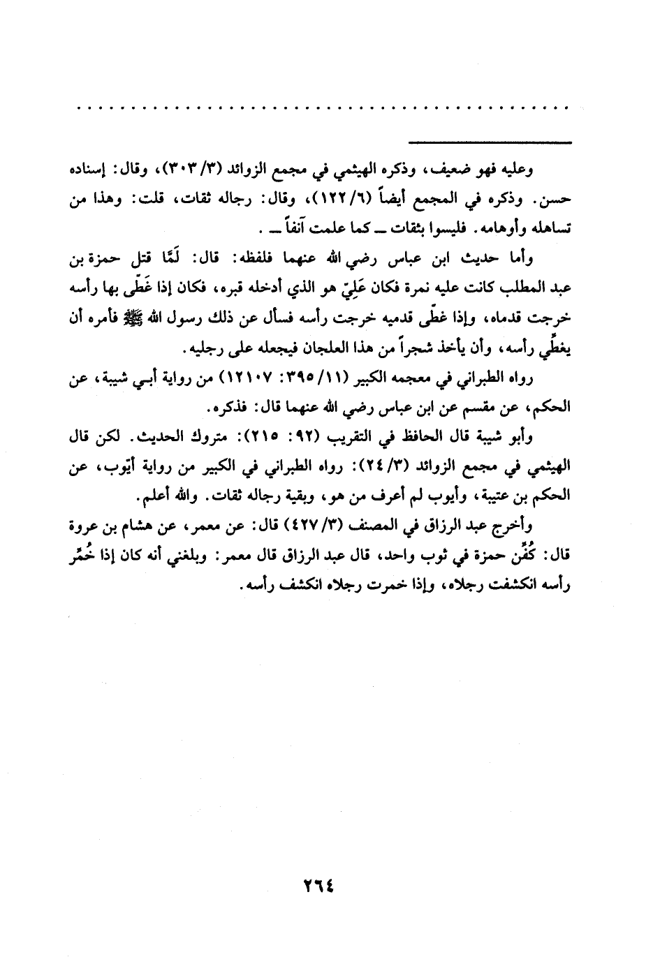 وأما حديث ابن عباس رضي الله عنهما فلفظه: قال: لَمَّا قتل حمزة بن عبد المطلب كانت عليه نمرة فكان عَلِيّ هو الذي أدخله قبره، فكان إذا غَطّى بها رأسه خرجت قدماه، وإذا غطّى قدميه خرجت رأسه فسأل عن ذَلِكَ رَسُولُ اللَّهِ -صَلَّى اللَّهُ عَلَيْهِ وَسَلَّمَ- فأمره أن يغطِّي رأسه، وأن يأخذ شجرًا من هذا العلجان فيجعله على رجليه.