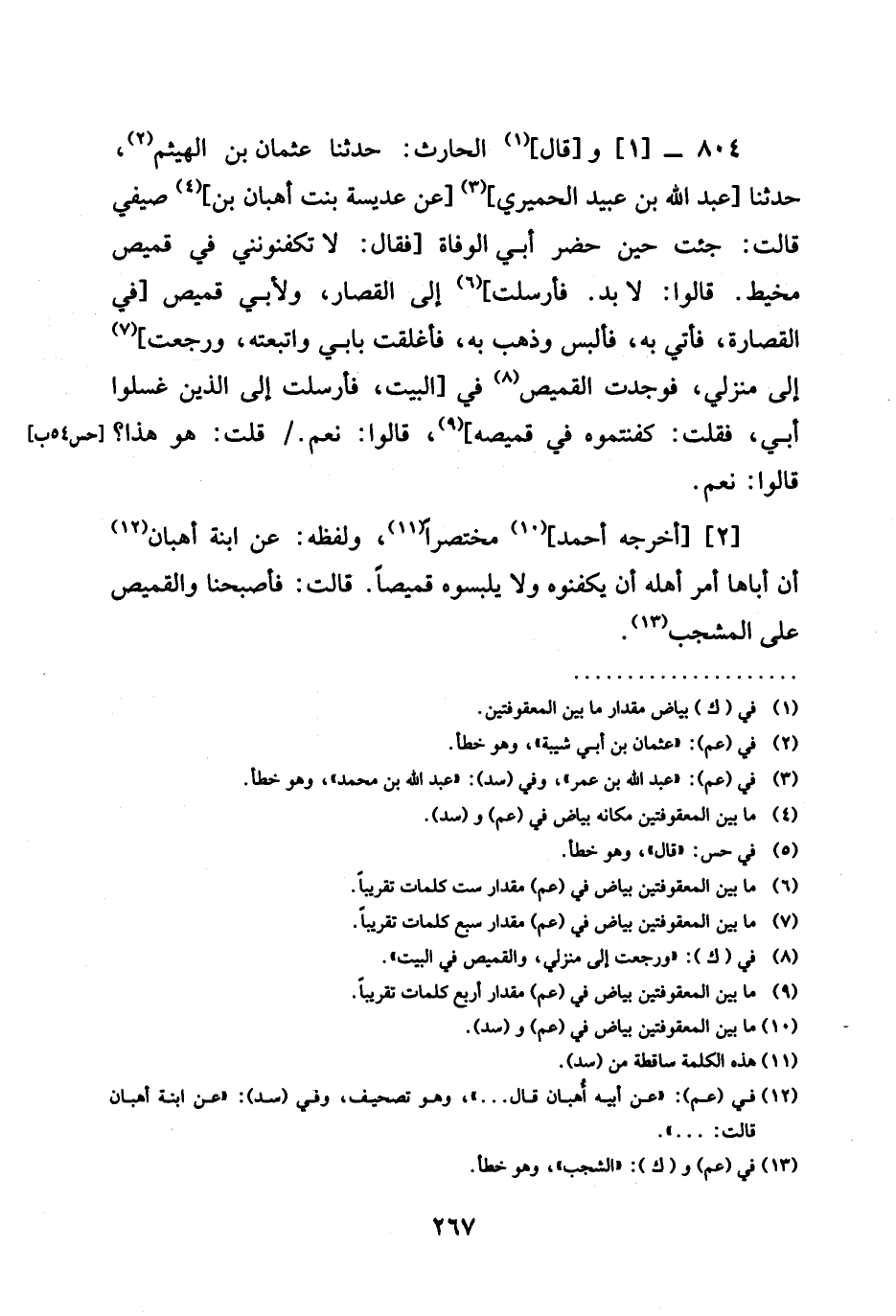 حَدَّثَنَا عُثْمَانُ بْنُ الْهَيْثَمِ حَدَّثَنَا عَبْدُ اللَّهِ بْنُ عُبَيْدٍ الْحِمْيَرِيُّ عَنْ عُدَيْسَةَ بِنْتِ أُهْبَانَ بْنِ صَيْفِيٍّ قَالَتْ جِئْتُ حِينَ حَضَرَ أَبِي الوفاة فقال §لا تكفنونني فِي قَمِيصٍ مخيط قالوا لابد فَأَرْسَلْتُ إِلَى الْقَصَّارِ وَلِأَبِي قَمِيصٌ فِي الْقِصَارَةِ فَأُتِيَ بِهِ فَأُلْبِسَ وَذُهِبَ بِهِ فَأَغْلَقْتُ بَابِي وَاتَّبَعْتُهُ وَرَجَعْتُ إِلَى مَنْزِلِي فَوَجَدْتُ الْقَمِيصَ فِي الْبَيْتِ فَأَرْسَلْتُ إِلَى الَّذِينَ غَسَّلُوا أَبِي فَقُلْتُ كَفَّنْتُمُوهُ فِي قَمِيصِهِ قَالُوا نَعَمْ قُلْتُ هُوَ هَذَا قَالُوا نَعَمْ أَخْرَجَهُ أَحْمَدُ مُخْتَصَرًا وَلَفْظُهُ عَنِ ابْنَةِ أُهْبَانَ أَنَّ أَبَاهَا أَمَرَ أَهْلَهُ أَنْ يُكَفِّنُوهُ وَلَا يُلْبِسُوهُ قَمِيصًا قَالَتْ فَأَصْبَحْنَا وَالْقَمِيصُ عَلَى الْمِشْجَبِ