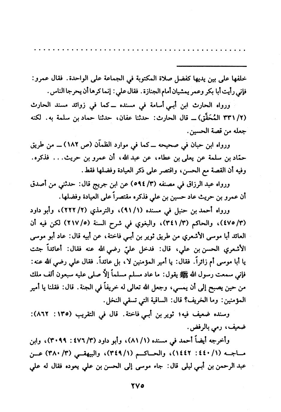 وأخرجه أيضًا أحمد في مسنده (1/ 81)، وأبو داود (3/ 476: 3099)، وابن ماجه (1/ 440: 1442)، والحاكم (1/ 349)، والبيهقي (3/ 380) عَنْ عَبْدِ الرَّحْمَنِ بْنِ أَبِي لَيْلَى قَالَ: جاء موس إلى الحسن بن علي يعوده فقال له علي =