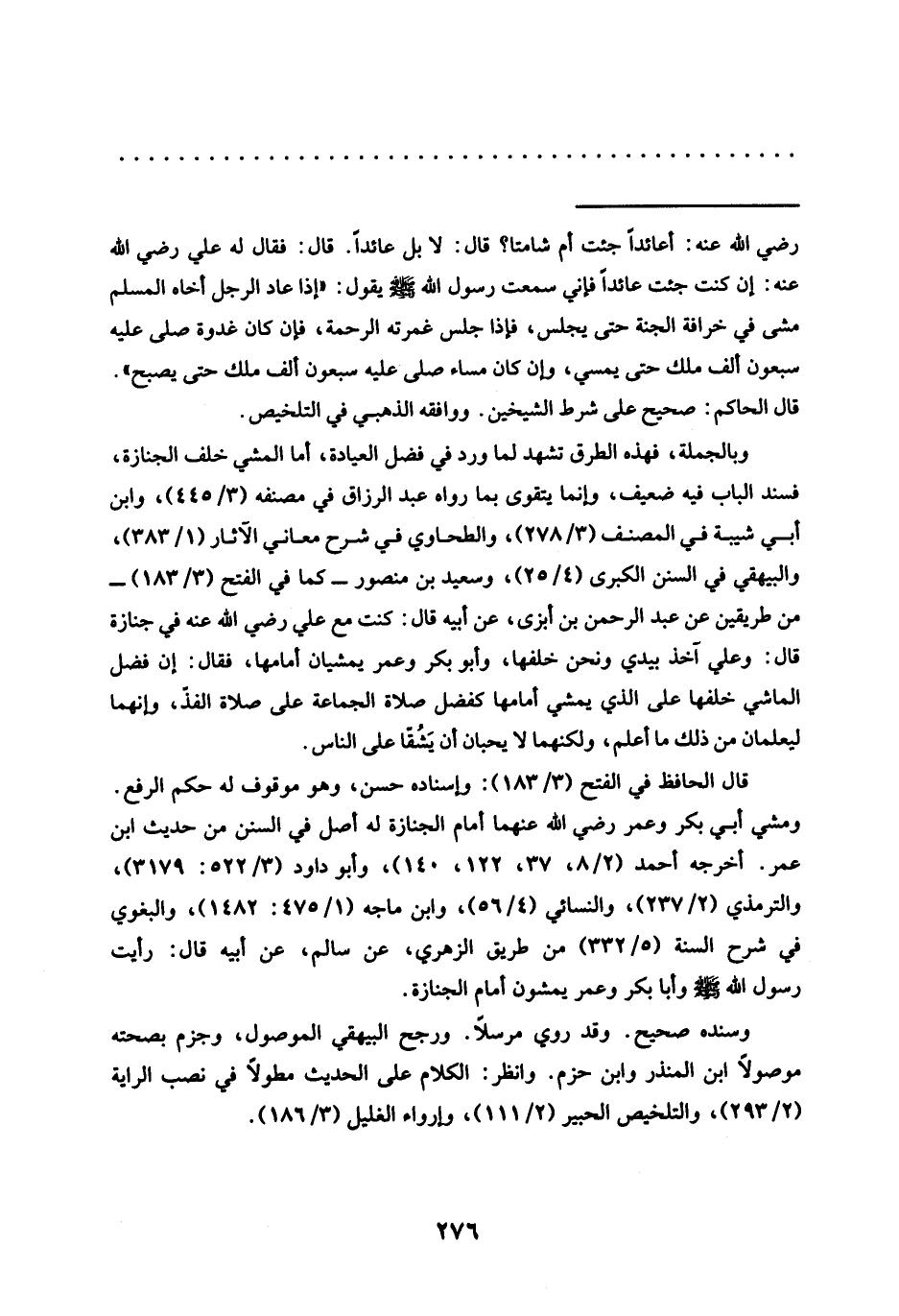 وبالجملة، فهذه الطرق تشهد لما ورد في فضل العيادة، أما المشي خلف الجنازة، فسند الباب فيه ضعيف، وإنما يتقوى بما رواه عبد الرزاق في مصنفه (3/ 445)، وابن أبي شيبة في المصنف (3/ 278)، والطحاوي في شرح معاني الآثار (1/ 383)، والبيهقي في السنن الكبرى (4/ 25)، وسعيد بن منصور -كما في الفتح (3/ 183) - من طريقين عن عبد الرحمن بن أبزى، عن أبيه قال: كنت مع علي رضي الله عنه في جنازة قال: وعلي آخذ بيدي ونحن خلفها، وأبو بكر وعمر يمشيان أمامها، فقال: إن فضل الماشي خلفها على الذي يمشي أمامها كفضل صلاة الجماعة على صلاة الفذ، وانهما ليعلمان من ذلك ما أعلم، ولكنهما لا يحبان أن يَشُقا على الناس.