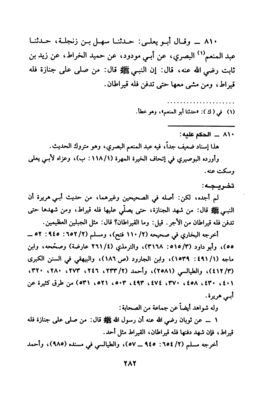 حَدَّثَنَا سَهْلُ بْنُ زَنْجَلَةَ حَدَّثَنَا عَبْدُ الْمُنْعِمِ الْبَصْرِيُّ عَنْ أَبِي مَوْدُودٍ عَنْ حُمَيْدٍ الْخَرَّاطِ عَنْ زَيْدِ بْنِ ثَابِتٍ رَضِيَ الله عَنْهُ قَالَ إِنَّ النَّبِيَّ صَلَّى اللَّهُ عَلَيْهِ وَسَلَّمَ قَالَ §مَنْ صَلَّى عَلَى جَنَازَةٍ فَلَهُ قِيرَاطٌ وَمَنْ مَشَى مَعَهَا حَتَّى تُدْفَنَ فَلَهُ قِيرَاطَانِ