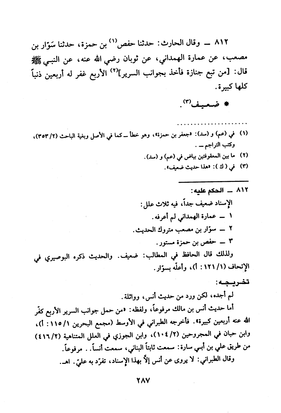 حَدَّثَنَا حَفْصُ بْنُ حَمْزَةَ حَدَّثَنَا سَوَّارُ بْنُ مُصْعَبٍ عَنْ عُمَارَةَ الْهَمْدَانِيِّ عَنْ ثَوْبَانَ رَضِيَ الله عَنْهُ عَنِ النَّبِيِّ صَلَّى اللَّهُ عَلَيْهِ وَسَلَّمَ قَالَ §مَنْ تَبِعَ جَنَازَةً فَأَخَذَ بِجَوَانِبِ السَّرِيرِ الْأَرْبَعِ غَفَرَ لَهُ أَرْبَعِينَ ذَنْبًا كُلُّهَا كَبِيرَةٌ