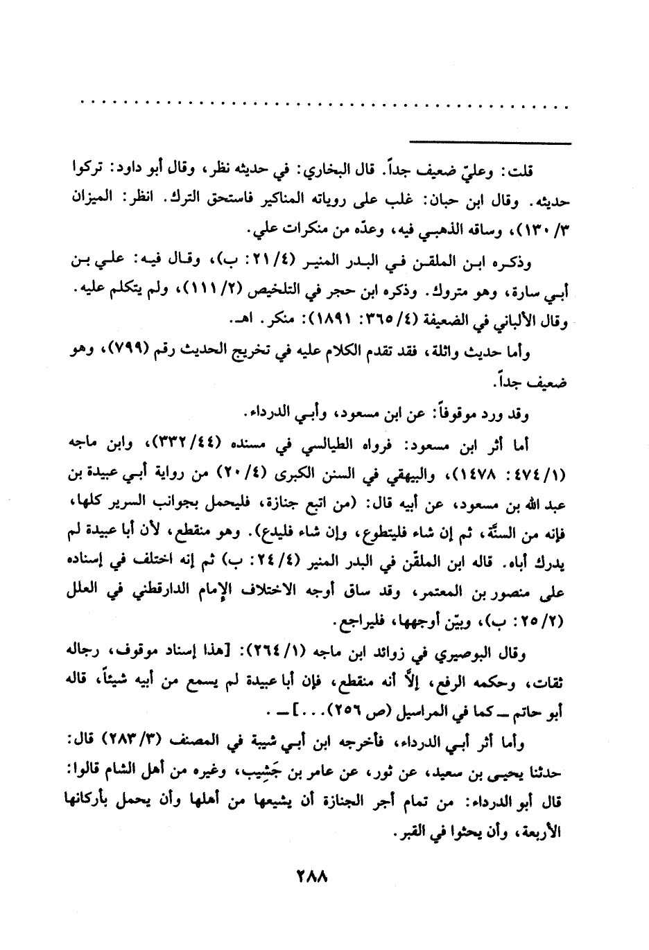 وأما أثر أبي الدرداء، فأخرجه ابن أبي شيبة في المصنف (3/ 283) قال: حدثنا يحيى بن سعيد، عن ثور، عن عامر بن جَشِيب، وغيره من أهل الشام قالوا: قال أبو الدرداء: من تمام أجر الجنازة أن يشيعها من أهلها وأن يحمل بأركانها الأربعة، وأن يحثوا في القبر. =