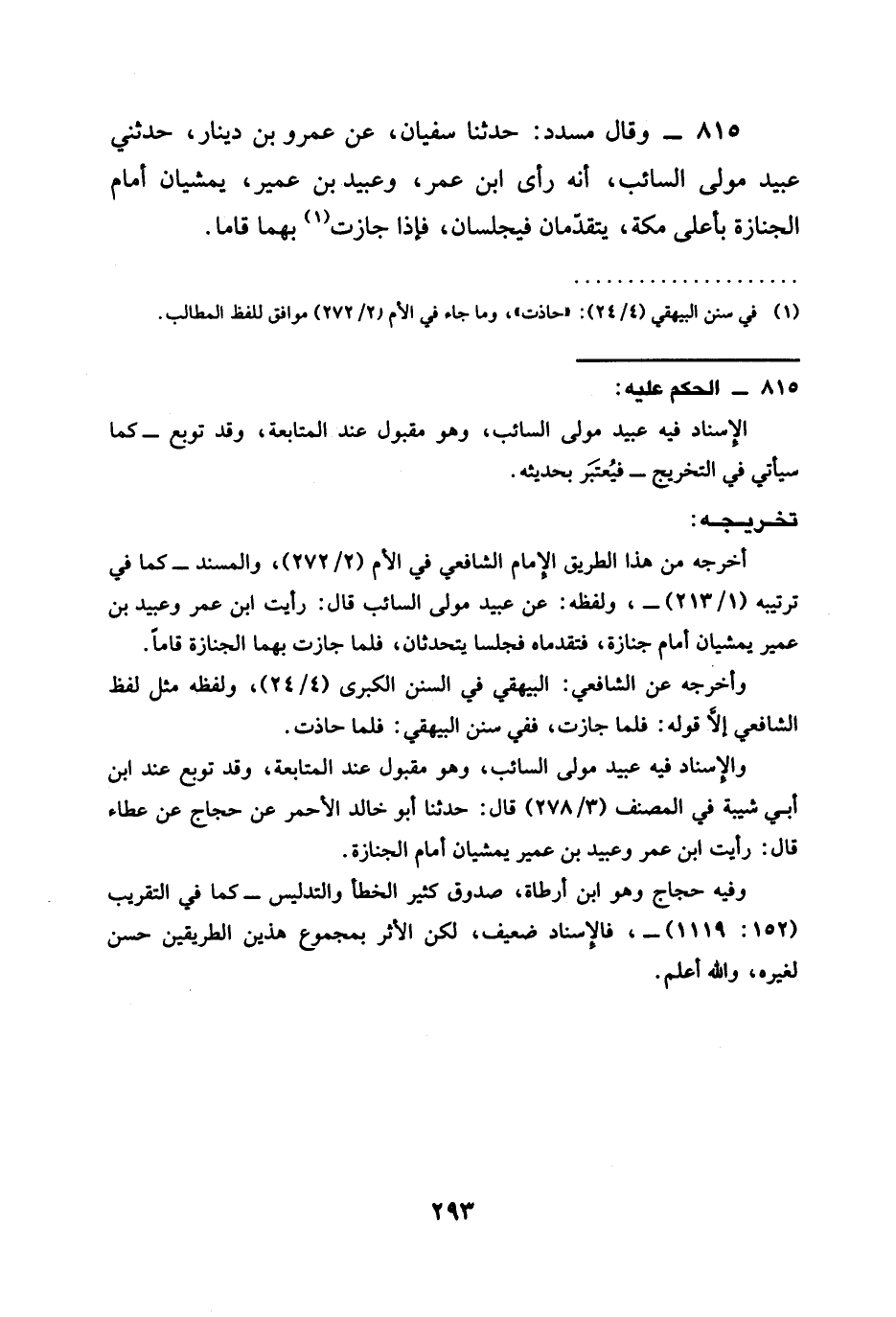 815 - وَقَالَ مُسَدَّدٌ حَدَّثَنَا سُفْيَانُ عَنْ عَمْرِو بْنِ دِينَارٍ حَدَّثَنِي عُبَيْدٌ مَوْلَى السَّائِبِ أَنَّهُ رَأَى ابْنَ عُمَرَ وَعُبَيْدَ بْنَ عُمَيْرٍ §يَمْشِيَانِ أَمَامَ الجناة بِأَعْلَى مَكَّةَ يَتَقَدَّمَانِ فَيَجْلِسَانِ فَإِذَا جَازَتْ بِهِمَا قَامَا