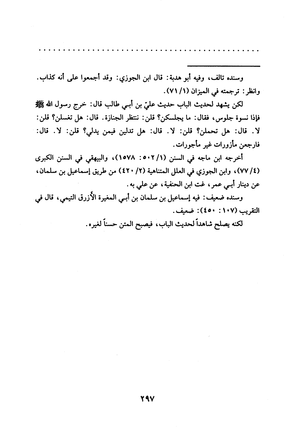 لكن يشهد لحديث الباب حديث عليّ بن أبي طالب قَالَ: خَرَجَ رَسُولُ اللَّهِ -صَلَّى اللَّهُ عَلَيْهِ وسلم- فإِذا نسوة جلوس، فقال: ما يجلسكن؟ قلن: ننتظر الجنازة. قال: هل تغسلن؟ قلن: لا. قال: هل تحملن؟ قلن: لا. قال: هل تدلين فيمن يدلي؟ قُلْنَ: لَا. قَالَ: فَارْجِعْنَ مَأْزُورَاتٍ غَيْرَ مَأْجُورَاتٍ.