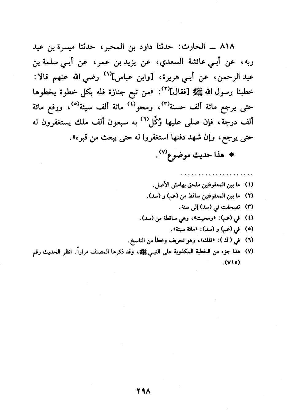 حَدَّثَنَا دَاوُدُ بْنُ الْمُحَبَّرِ حَدَّثَنَا مَيْسَرَةُ بْنُ عَبْدِ رَبِّهِ عَنْ أَبِي عَائِشَةَ السَّعْدِيِّ عَنْ يَزِيدَ بْنِ عُمَرَ عَنْ أَبِي سَلَمَةَ بْنِ عَبْدِ الرَّحْمَنِ عَنْ أَبِي هُرَيْرَةَ وَابْنِ عَبَّاسٍ رَضِيَ الله عَنْهُمْ قَالَا خَطَبَنَا رَسُولُ اللَّهِ صَلَّى اللَّهُ عَلَيْهِ وَسَلَّمَ فَقَالَ §مَنْ تَبِعَ جَنَازَةً فَلَهُ بِكُلِّ خُطْوَةٍ يَخْطُوهَا حَتَّى يَرْجِعَ مِائَةُ أَلْفِ حَسَنَةٍ وَمَحْوُ مِائَةِ أَلْفِ سَيِّئَةٍ وَرَفْعُ مِائَةِ أَلْفِ دَرَجَةٍ فَإِنْ صَلَّى عَلَيْهَا وُكِّلَ بِهِ سَبْعُونَ أَلْفَ مَلَكٍ يَسْتَغْفِرُونَ لَهُ حَتَّى يَرْجِعَ وَإِنْ شَهِدَ دفنا اسْتَغْفَرُوا لَهُ حَتَّى يُبْعَثَ مِنْ قَبْرِهِ