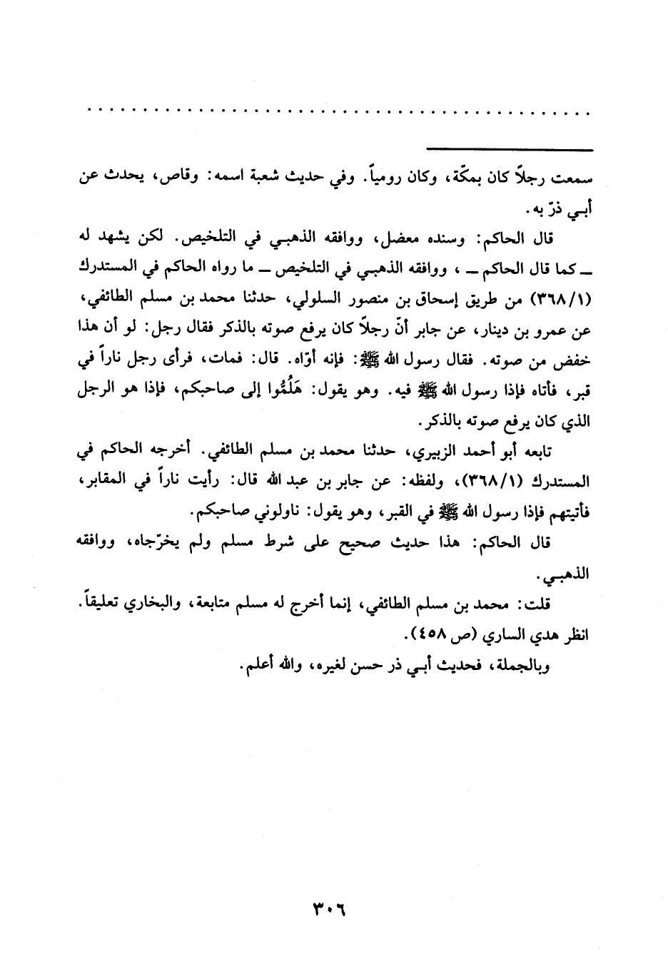 قال الحاكم: وسنده معضل، وواففه الذهبي في التلخيص. لكن يشهد له -كما قال الحاكم-، ووافقه الذهبي في التلخيص- ما رواه الحاكم في المستدرك (1/ 368) من طريق إسحاق بن منصور السلولي، حدثنا محمد بن مسلم الطائفي، عن عمرو بن دينار، عن جابر أنّ رجلًا كان يرفع صوته بالذكر فقال رجل: لو أن هذا خفض من صَوْتَهُ. فَقَالَ رَسُولُ اللَّهِ -صَلَّى اللَّهُ عَلَيْهِ وسلم-: فإِنه أوّاه. قال: فمات، فرأى رجل نارًا في قبر، فأتاه فإِذا رَسُولُ اللَّهِ -صَلَّى اللَّهُ عَلَيْهِ وَسَلَّمَ- فيه. وهو يقول: هَلُمُّوا إلى صاحبكم، فإِذا هو الرجل الذي كان يرفع صوته بالذكر.