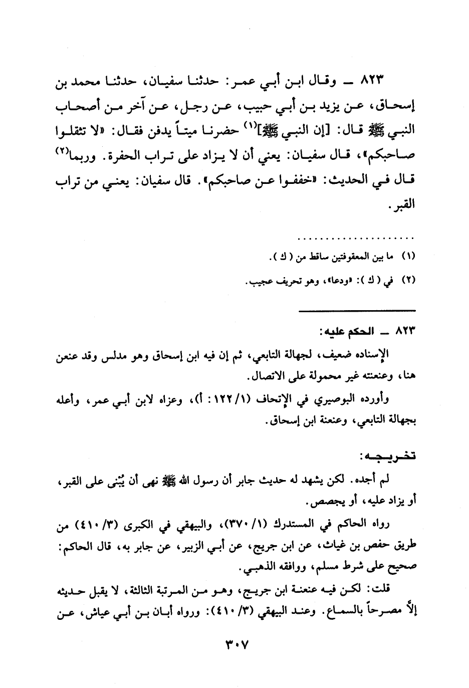 حَدَّثَنَا سُفْيَانُ حَدَّثَنَا مُحَمَّدُ بْنُ إِسْحَاقَ عَنْ يَزِيدَ بْنِ أَبِي حَبِيبٍ عَنْ رَجُلٍ عَنْ آخَرَ مِنْ أَصْحَابِ النَّبِيِّ صَلَّى اللَّهُ عَلَيْهِ وَسَلَّمَ قَالَ إن النبي صَلَّى اللَّهُ عَلَيْهِ وَسَلَّمَ حضرنا مَيِّتًا يُدْفَنُ فَقَالَ §لَا تُثْقِلُوا صَاحِبَكُمْ قَالَ سُفْيَانُ يَعْنِي أَنْ لَا يُزَادَ عَلَى تُرَابِ الْحُفْرَةِ وَرُبَّمَا قَالَ فِي الْحَدِيثِ خَفِّفُوا عَنْ صَاحِبِكُمْ قَالَ سُفْيَانُ يَعْنِي مِنْ تُرَابِ الْقَبْرِ