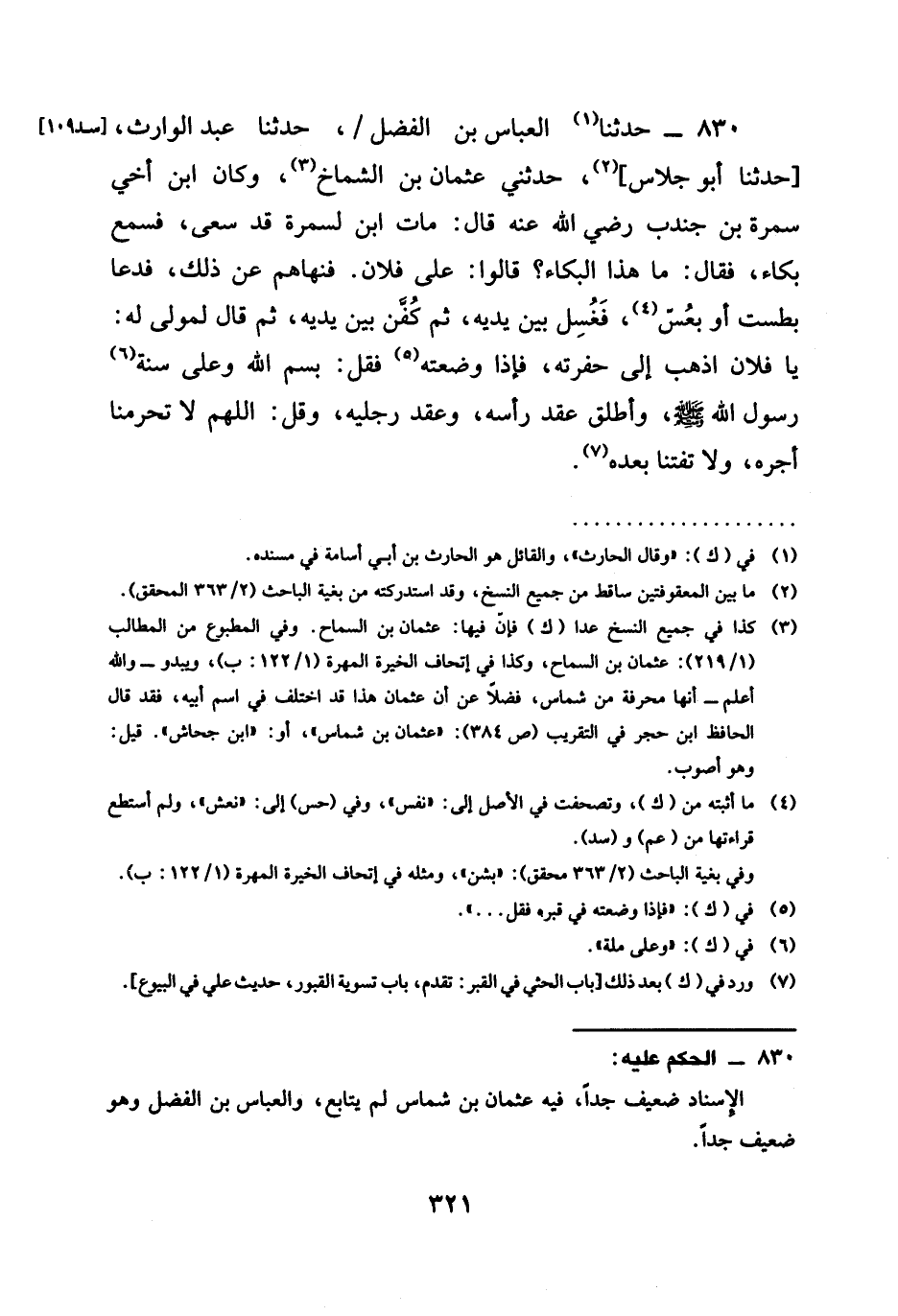 830 - حَدَّثَنَا الْعَبَّاسُ بْنُ الْفَضْلِ حَدَّثَنَا عَبْدُ الْوَارِثِ حَدَّثَنَا أَبُو جَلَّاسٍ حَدَّثَنِي عُثْمَانُ بْنُ الشماخ وَكَانَ ابْنُ أَخِي سَمُرَةَ بْنِ جُنْدُبٍ رَضِيَ الله عَنْهُ قَالَ مَاتَ ابْنٌ لِسَمُرَةَ قَدْ سَعَى فَسَمِعَ بُكَاءً فَقَالَ مَا هَذَا الْبُكَاءُ قَالُوا عَلَى فُلَانٍ فَنَهَاهُمْ عَنْ ذلك فدعا طست أَوْ بِعُسٍّ فَغُسِّلَ بَيْنَ يَدَيْهِ ثُمَّ كُفِّنَ بَيْنَ يَدَيْهِ ثُمَّ قَالَ لِمَوْلًى لَهُ يَا فُلَانُ §اذْهَبْ إِلَى حُفْرَتِهِ فَإِذَا وَضَعْتَهُ فَقُلْ بِسْمِ اللَّهِ وَعَلَى سُنَّةِ رَسُولِ اللَّهِ صَلَّى اللَّهُ عَلَيْهِ وَسَلَّمَ وَأَطْلِقْ عُقَدَ رَأْسِهِ وعُقَدَ رِجْلَيْهِ وَقُلِ اللَّهُمَّ لَا تَحْرِمْنَا أَجْرَهُ وَلَا تَفْتِنَّا بَعْدَهُ