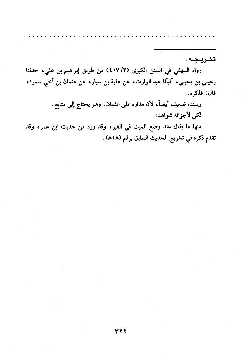 رواه البيهقي في السنن الكبرى (3/ 407) من طريق إبراهيم بن علي، حدثنا يحيى بن يحيى، أنبأنا عبد الوارث، عن عقبة بن سيار، عن عثمان بن أخي سمرة، قال: فذكره.
