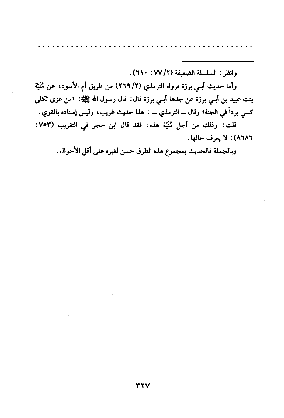 قلت: وذلك من أجل مُنيّة هذه، فقد قال ابن حجر في التقريب (753: 8686): لا يعرف حالها.