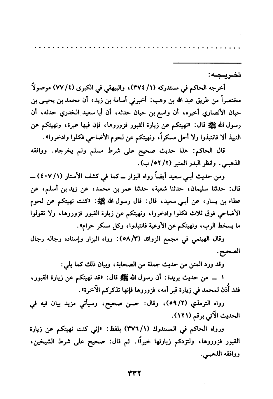 أخرجه الحاكم في مستدركه (1/ 374)، والبيهقي في الكبرى (4/ 77) موصولًا مختصرًا من طريق عبد الله بن وهب: أخبرني أسامة بن زيد، أن محمد بن يحيى بن حبان الأنصارى أخبره، أن واسع حبان حدثه، أن أبا سعيد الخدري حَدَّثَهُ، أَنَّ رَسُولَ. اللَّهِ -صَلَّى اللَّهُ عَلَيْهِ وسلم- قال: "نهيتكم عن زيارة القبور فزوروها، فإِن فيها عبرة، ونهيتكم عن النبيذ ألا فانتبذوا ولا أحل مسكرًا، ونهيتكم عن لحوم الأضاحي فكلوا وادخروا".