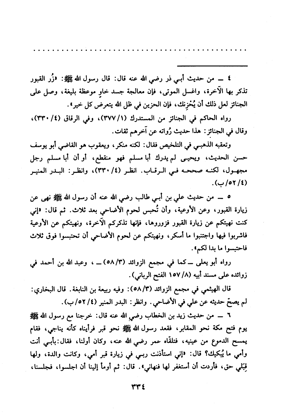 5 - من حَدِيثُ عَلِيِّ بْنِ أَبِي طَالِبٍ رَضِيَ اللَّهُ عنه أن رسول الله -صلى الله عليه وسلم- نهى عن زيارة القبور، وعن الأوعية، وأن تُحبس لحوم الاضاحي بعد ثلاث. ثم قال: "إني كنت نهيتكم عن زيارة القبور فزوروها، فإنها تذكركم الآخرة، ونهيتكم عن الأوعية فاشربوا فيها واجتنبرا ما أسكر، ونهيتكم عن لحوم الأضاحي أن تحتبسوا فوق ثلاث فاحتبسوا ما بدا لكم".