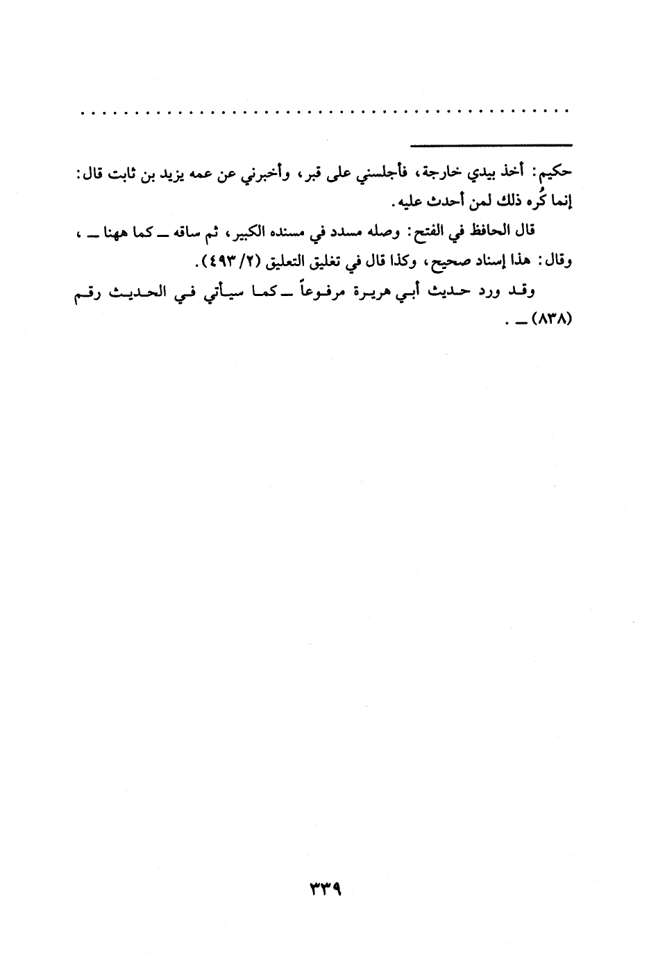 = حكيم: أخذ بيدي خارجة، فأجلسني على قبر، وأخبرني عن عمه يزيد بن ثابت قال: إنما كره ذلك لمن أحدث عليه.