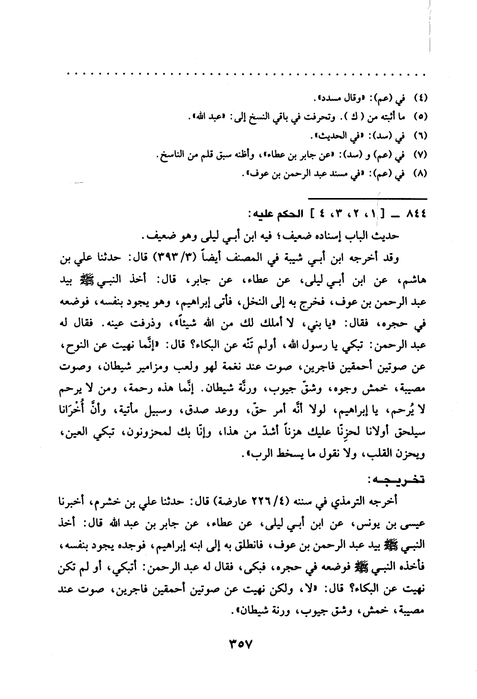 وقد أخرجه ابن أبي شيبة في المصنف أيضًا (3/ 393) قال: حَدَّثَنَا عَلِيُّ بْنُ هَاشِمٍ، عَنِ ابْنِ أَبِي ليلى، عن عطاء، عن جابر، قال: أخذ النبي -صَلَّى اللَّهُ عَلَيْهِ وَسَلَّمَ- بِيَدِ عَبْدِ الرَّحْمَنِ بن عوف، فخرج به إلى النخل، فأتى إبراهيم، وهو يجود بنفسه، فوضعه في حجره، فقال: "يا بني، لا أملك لك من الله شيئًا"، وذرفت عينه. فقال له عبد الرحمن: تبكي يا رسول الله، أو لم تَنْه عن البكاء؟ قال: "إنَّما نهيت عن النوح، عن صوتين أحمقين فاجرين، صوت عند نغمة لهو ولعب ومزامير شيطان، وصوت مصيبة، خمش وجوه، وشقّ جيوب، ورنَّة شيطان. إنَّما هَذِهِ رَحْمَةٌ، وَمَنْ لَا يَرْحَمُ لَا يُرحم، يَا إِبْرَاهِيمُ، لَوْلَا أنَّه أَمْرُ حَقٍّ، ووعد صدق، وسببل مأتية، وأنَّ أُخْرَانا سيلحق أولانا لحزِنّا عليك هزنًا أشدّ من هذا، وإنّا بك لمحزونون، تَبْكِي الْعَيْنُ، وَيَحْزَنُ الْقَلْبُ، وَلَا نَقُولُ مَا يسخط الرب".