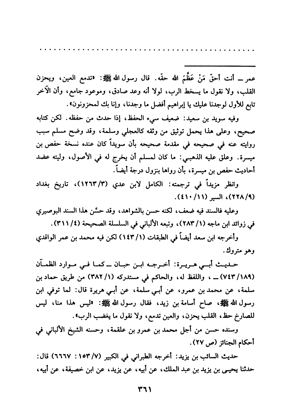 = عمر- أنت أحقّ مَنْ عَظَّمَ الله حقّه. قَالَ رَسُولُ اللَّهِ -صَلَّى اللَّهُ عَلَيْهِ وَسَلَّمَ-: "تدمع الْعَيْنُ، وَيَحْزَنُ الْقَلْبُ، وَلَا نَقُولُ مَا يُسْخِطُ الرب، لولا أنه وعد صادق، وموعود جامع، وأن الآخر تابع للأول لوجدنا عليك يا إبراهيم أفضل ما وجدنا، وإنا بك لمحزونون".