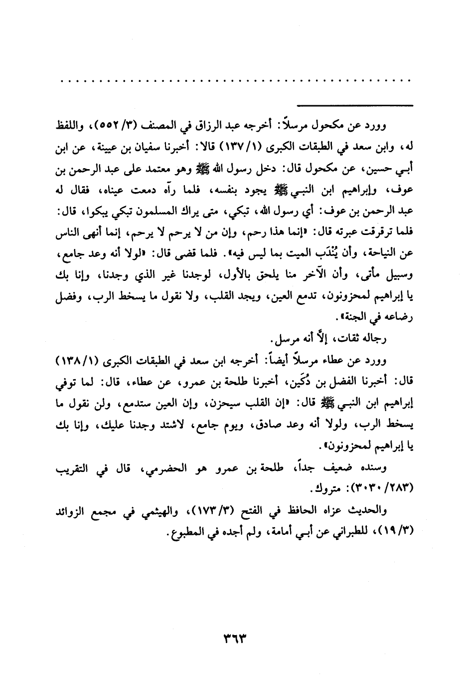 = وورد عن مكحول مرسلًا: أخرجه عبد الرزاق في المصنف (3/ 552)، واللفظ له، وابن سعد في الطبقات الكبرى (1/ 137) قالا: أخبرنا سفيان بن عيينة، عن ابن أبي حسين، عن مكحول قال: دَخَلَ رَسُولُ اللَّهِ -صَلَّى اللَّهُ عَلَيْهِ وَسَلَّمَ- وهو معتمد على عبد الرحمن بن عوف، وإبراهيم ابن النبي -صلى الله عليه وسلم- يجود بنفسه، فلما رآه دمعت عيناه، فقال له عبد الرحمن بن عوف: أي رسول الله، تبكي، متى يراك المسلمون تبكي يبكوا، قال: فلما ترقرقت عبرته قال: "إنما هذا رحم، وإن من لا يرحم لا يرحم، إنما أنهى الناس عن النياحة، وأن يُنْدَب الميت بما ليس فيه". فلما قضى قال: "لولا أنه وعد جامع، وسبيل مأتى، وأن الآخر منا يلحق بالأول، لوجدنا غير الذي وجدنا، وإنا بك يا إبراهيم لمحزونون، تدمع العين، ويجد القلب، ولا نقول ما يسخط الرب، وفضل رضاعه في الجنة".