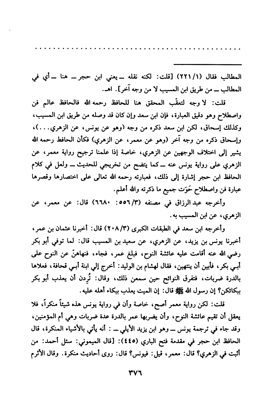 قلت: لكن رواية معمر أصح، خاصة وأن في رواية يونس هذه شيئًا منكرًا، فلا يعقل أن تقيم عائشة النوح، وأن يضربها عمر بالدرة عدة ضربات وهي أم المؤمنين، وقد جاء في ترجمة يونس -وهو ابن بزيد الأيلي-: أنه يأتي بالأشياء المنكرة، قال الحافظ ابن حجر في مقدمة فتح الباري (445): [قال الميموني: سئل أحمد: من أثبت في الزهري؟ قال: معمر، قيل: فيونس؟ قال: روى أحاديث منكرة. وقال الأثرم=