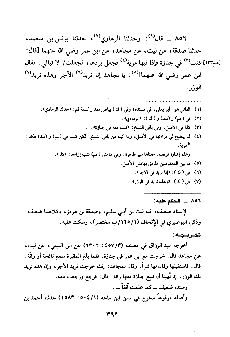 وَحَدَّثَنَا الرَّهَاوِيُّ حَدَّثَنَا يُونُسُ بْنُ مُحَمَّدٍ حَدَّثَنَا صَدَقَةُ عَنْ لَيْثٍ عَنْ مُجَاهِدٍ عَنِ ابْنِ عُمَرَ رَضِيَ الله عَنْهُمَا قَالَ كُنْتُ فِي جَنَازَةٍ فَإِذَا فِيهَا مُرَيَّةٌ فَجَعَلَ يَرُدُّهَا فَجَعَلَتْ لَا تُبَالِي فَقَالَ ابْنُ عُمَرَ رَضِيَ الله عَنْهُمَا يَا مُجَاهِدُ §إِنَّا نُرِيدُ الْأَجْرَ وَهَذِهِ تُرِيدُ الْوِزْرَ