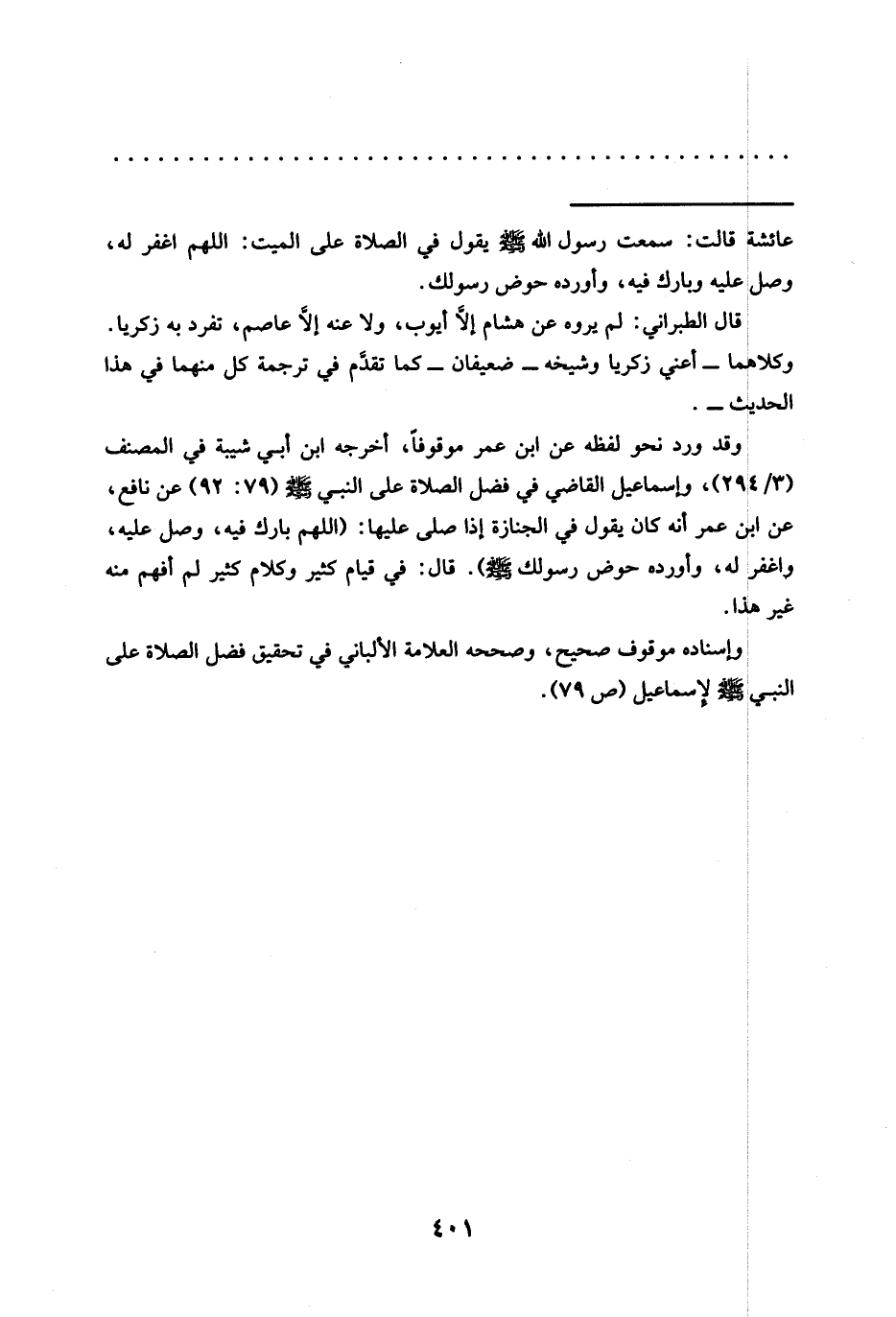 = عَائِشَةَ قَالَتْ: سَمِعْتُ رَسُولَ اللَّهِ -صَلَّى اللَّهُ عليه وَسَلَّمَ- يَقُولُ فِي الصَّلَاةِ عَلَى الْمَيِّتِ: اللَّهُمَّ اغفر له، وصل عليه وبارك فيه، وأورده حوض رسولك.