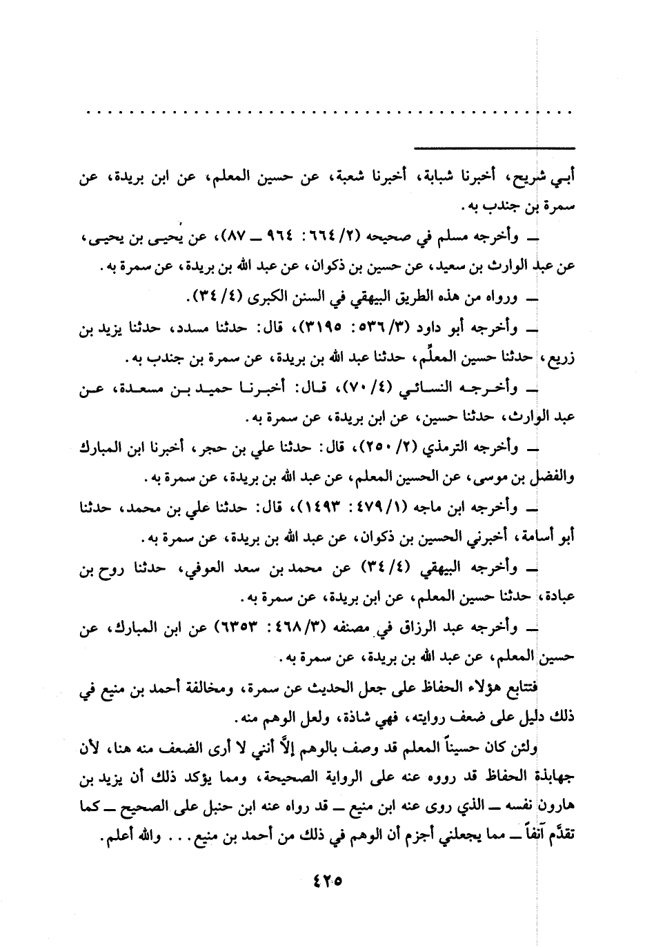 ولئن كان حسينًا المعلم قد وصف بالوهم إلَّا أنني لا أرى الضعف منه هنا، لأن جهابذة الحفاظ قد رووه عنه على الرواية الصحيحة ومما يؤكد ذلك أن يزيد بن هارون نفسه -الذي روى عنه ابن منيع- قد رواه عنه ابن حنبل على الصحيح -كما تقدِّم آنفًا- بما يجعلني أجزم أن الوهم في ذلك من أحمد بن منيع ... والله أعلم.