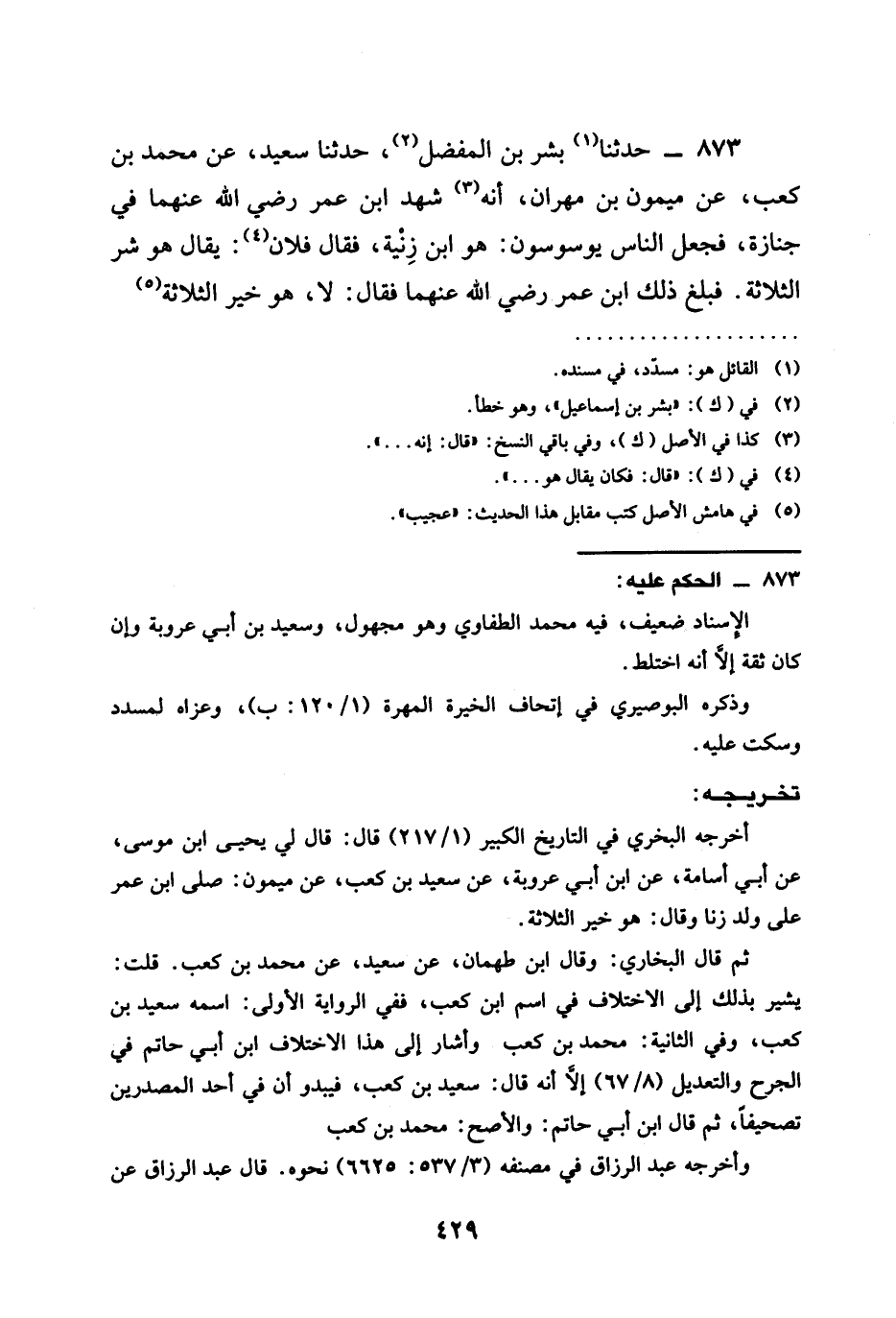 873 - حَدَّثَنَا بِشْرُ بْنُ الْمُفَضَّلِ حَدَّثَنَا سَعِيدٌ عَنْ مُحَمَّدِ بْنِ كَعْبٍ عَنْ مَيْمُونِ بْنِ مِهْرَانَ أَنَّهُ شَهِدَ ابْنَ عُمَرَ رَضِيَ الله عَنْهُمَا فِي جَنَازَةٍ فَجَعَلَ النَّاسُ يُوَسْوِسُونَ هُوَ ابْنُ زِنْيَةٍ فَقَالَ فُلَانٌ يُقَالُ هُوَ شَرُّ الثَّلَاثَةِ فَبَلَغَ ذَلِكَ ابْنُ عُمَرَ رَضِيَ الله عَنْهُمَا فَقَالَ §لَا هُوَ خَيْرُ الثَّلَاثَةِ