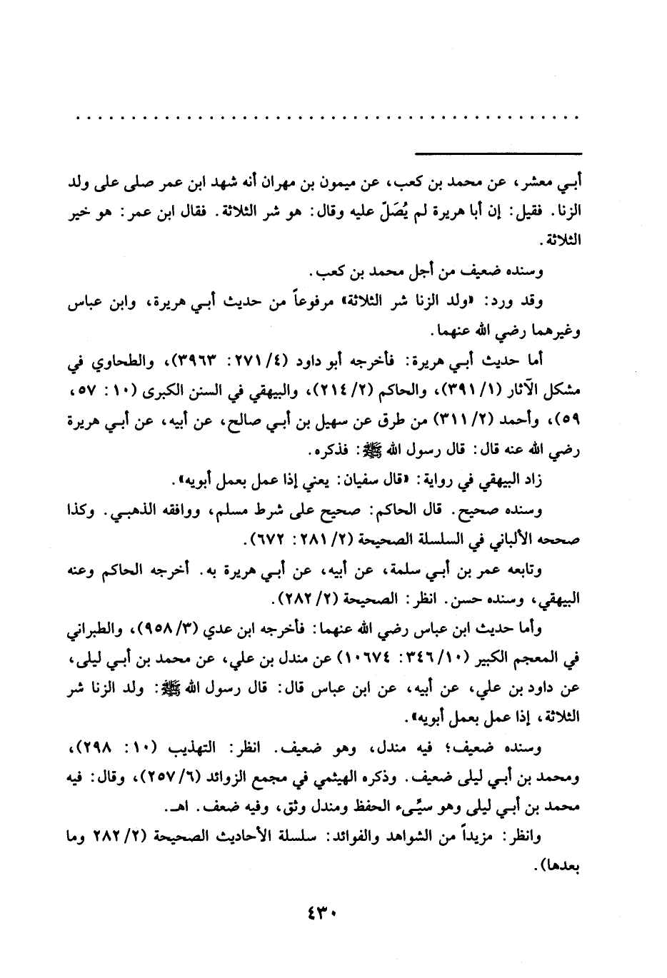 = أبي معشر، عَنْ مُحَمَّدِ بْنِ كَعْبٍ، عَنْ مَيْمُونِ بْنِ مهران أنه شهد ابن عمر صلى على ولد الزنا. فقيل: إن أبا هريرة لم يُصَلّ عليه وقال: هو شر الثلاثة. فقال ابن عمر: هو خير الثلاثة.