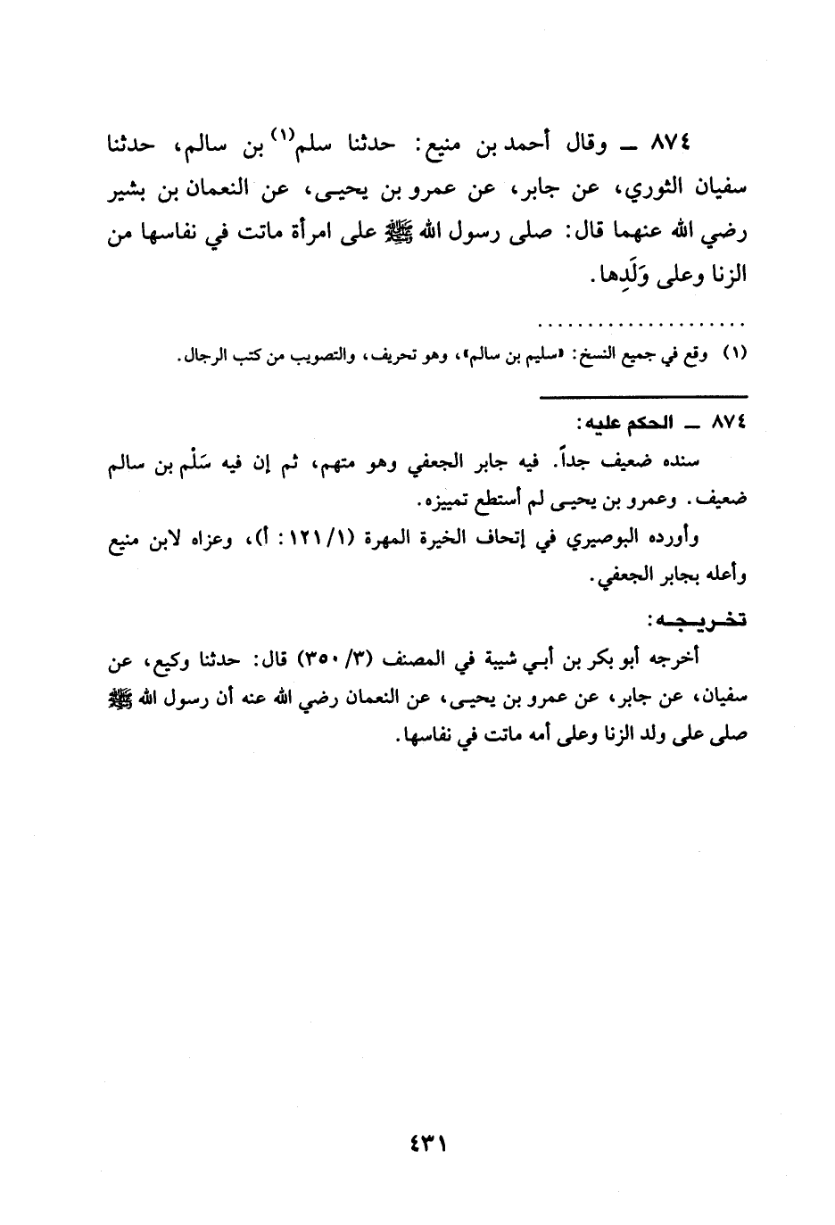 874 - وَقَالَ أَحْمَدُ بْنُ مَنِيعٍ حَدَّثَنَا سَلْمُ بْنُ سَالِمٍ حَدَّثَنَا سُفْيَانُ الثَّوْرِيُّ عَنْ جَابِرٍ عَنْ عَمْرِو بْنِ يَحْيَى عَنِ النُّعْمَانِ بْنِ بَشِيرٍ رَضِيَ الله عَنْهُمَا قَالَ §صَلَّى رَسُولُ اللَّهِ صَلَّى اللَّهُ عَلَيْهِ وَسَلَّمَ عَلَى امْرَأَةٍ مَاتَتْ فِي نِفَاسِهَا مِنَ الزِّنَا وَعَلَى وَلَدِهَا