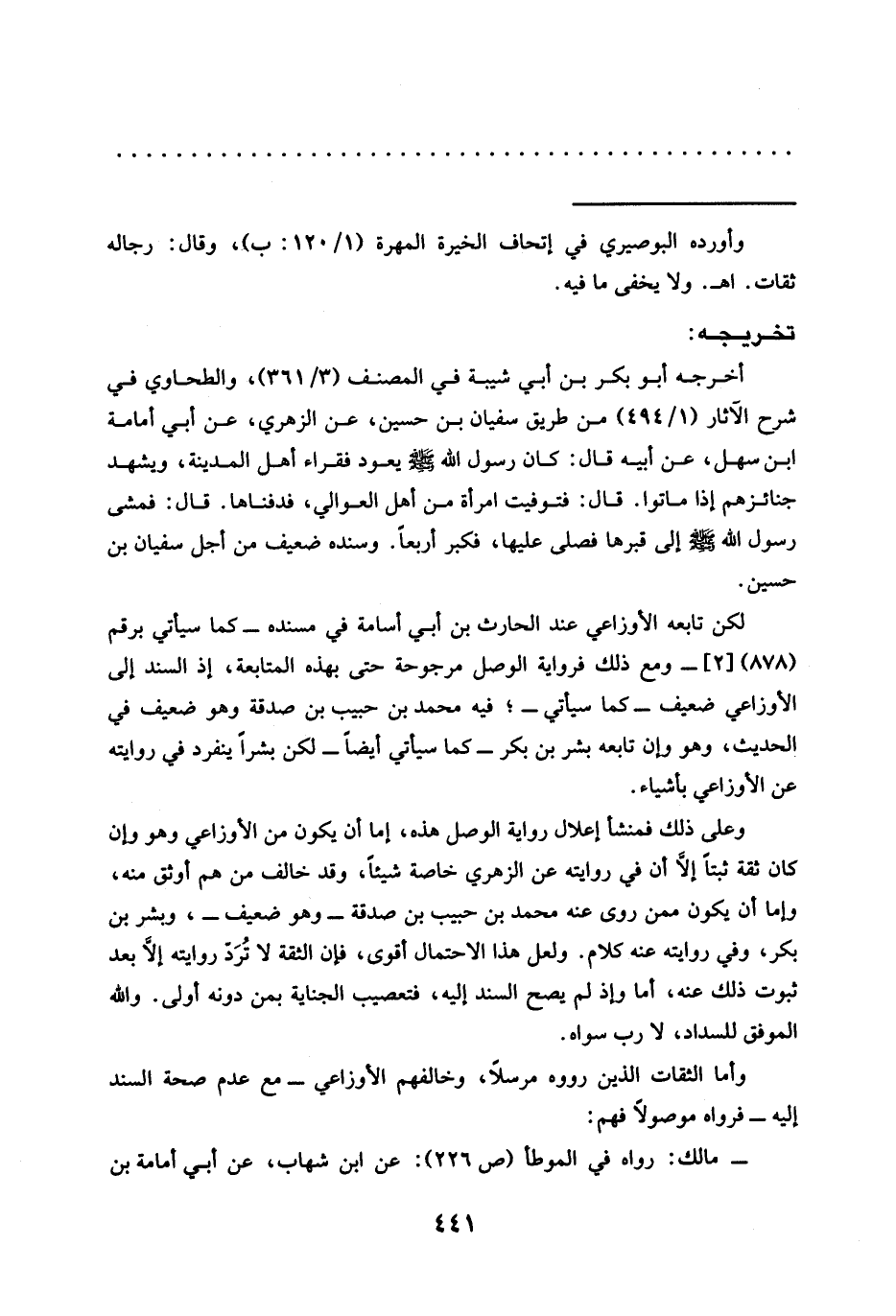وعلى ذلك فمنشأ إعلال رواية الوصل هذه، إما أن يكون من الأوزاعي وهو وإن كان ثقة ثبتًا إلَّا أن في روايته عن الزهري خاصة شيئًا، وقد خالف من هم أوثق منه، وإما أن يكون ممن روى عنه محمد بن حبيب بن صدقة -وهو ضعيف-، وبشر بن بكر، وفي روايته عنه كلام. ولعل هذا الاحتمال أقوى، فإِن الثقة لا تُرَدّ روايته إلَّا بعد ثبوت ذلك عنه، أما وإذ لم يصح السند إليه، فتعصيب الجناية بمن دونه أولى. والله الموفق للسداد، لا رب سواه.