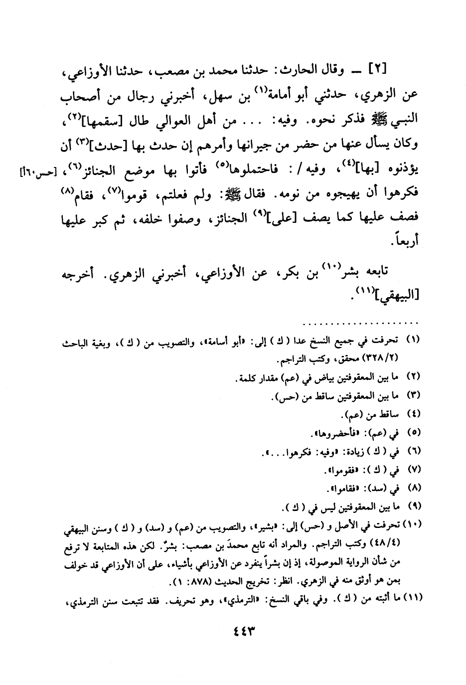 حَدَّثَنَا مُحَمَّدُ بْنُ مُصْعَبٍ حَدَّثَنَا الْأَوْزَاعِيُّ عَنِ الزُّهْرِيِّ حَدَّثَنِي أَبُو أُمَامَةَ بْنُ سَهْلٍ أَخْبَرَنِي رِجَالٌ مِنْ أَصْحَابِ النَّبِيِّ صَلَّى اللَّهُ عَلَيْهِ وَسَلَّمَ فَذَكَرَ نَحْوَهُ وَفِيهِ مَنْ أَهْلِ الْعَوَالِي طَالَ سَقَمُهَا وَكَانَ يَسْأَلُ عَنْهَا مَنْ حَضَرَ مِنْ جِيرَانِهَا وَأَمَرَهُمْ إِنْ حَدَثَ بِهَا حَدَثٌ أَنْ يُؤْذِنُوهُ بِهَا وَفِيهِ فَاحْتَمَلُوهَا فَأَتَوْا بِهَا مَوْضِعَ الْجَنَائِزِ فَكَرِهُوا أَنْ يُهَيِّجُوهُ مِنْ نَوْمِهِ فَقَالَ صَلَّى اللَّهُ عَلَيْهِ وَسَلَّمَ وَلِمَ فَعَلْتُمْ قُومُوا فقام فصف عليه كَمَا يَصِفُّ عَلَى الْجَنَائِزِ وَصَفُّوا خَلْفَهُ §ثُمَّ كَبَّرَ عَلَيْهَا أَرْبَعًا تَابَعَهُ بِشْرُ بْنُ بَكْرٍ عَنِ الوزاعي أَخْبَرَنِي الزُّهْرِيُّ أَخْرَجَهُ الْبَيْهَقِيُّ