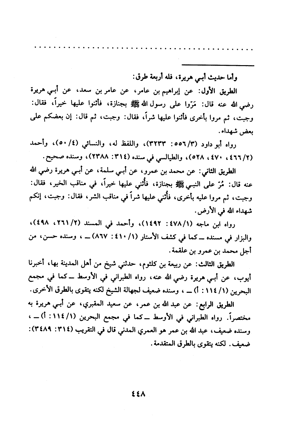 الطريق الأول: عن إبراهيم بن عامر، عن عامر بن سعد، عن أبي هريرة رضي الله عنه قال: مَرّوا على رسول الله -صلى الله عليه وسلم- بجنازة، فأثنوا عليها خيرًا، فقال: وجبت، ثم مروا بأخرى فاثنوا عليها شرًا، فقال: وجبت، ثم قال: إن بعضكم على بعض شهداء.