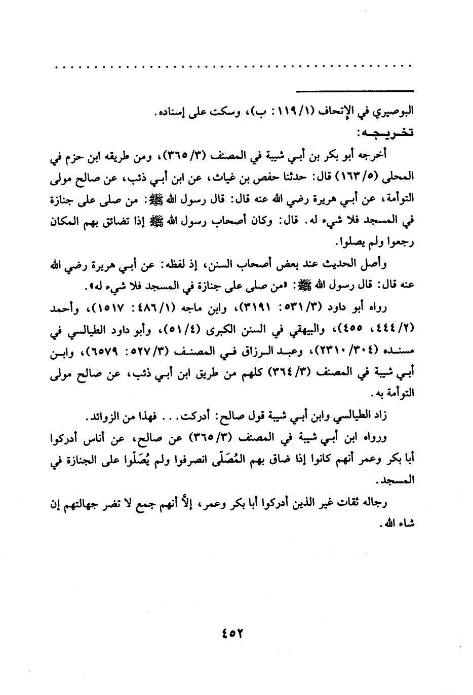 رواه أبو داود (3/ 531: 3191)، وابن ماجه (1/ 486: 1517)، وأحمد (2/ 444، 455)، والبيهقي في السنن الكبرى (4/ 51)، وأبو داود الطيالسي في مسنده (304/ 2310)، وعبد الرزاق في المصنف (3/ 527: 6579)، وابن أبي شيبة في المصنف (3/ 364) كلهم من طريق ابْنُ أَبِي ذِئْبٍ، عَنْ صَالِحٍ مَوْلَى التَّوْأَمَةِ به.