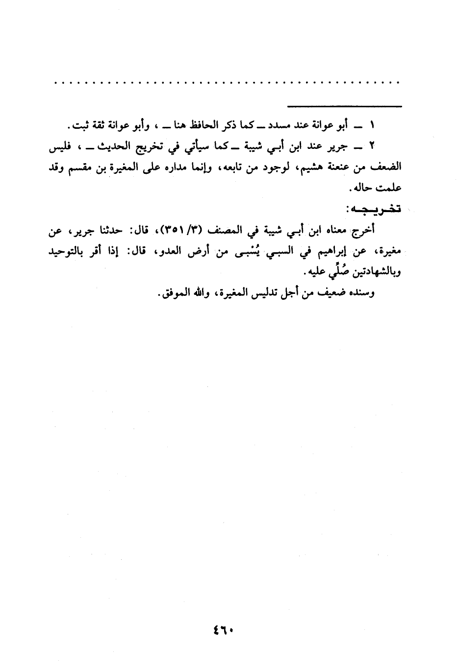 2 - جرير عند ابن أبي شيبة -كما سيأتي في تخريج الحديث-، فليس الضعف من عنعنة هشيم، لوجود من تابعه، وإنما مداره على المغيرة بن مقسم وقد علمت حاله.