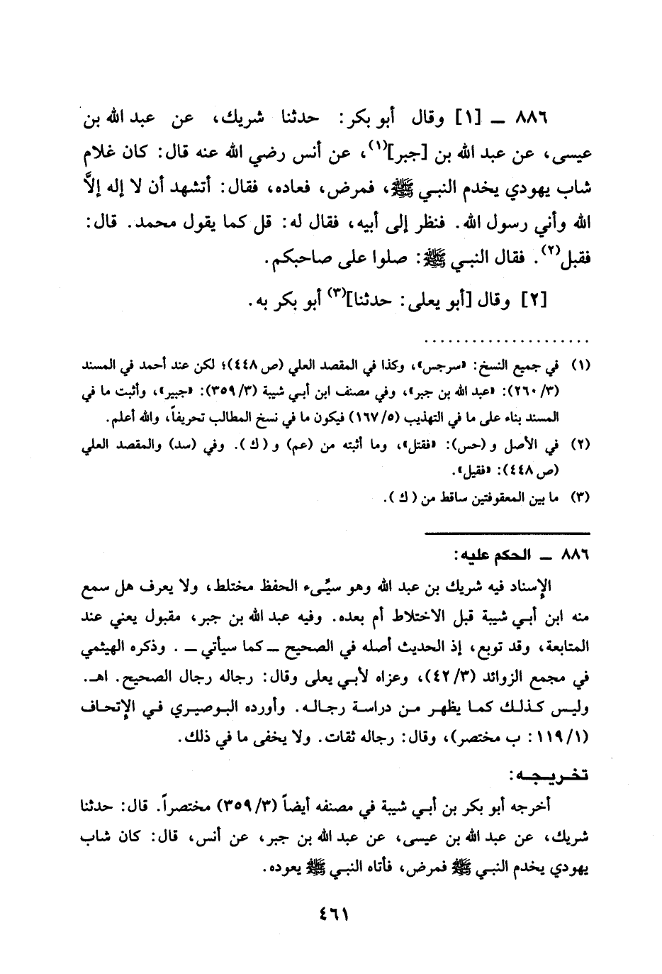 حَدَّثَنَا شَرِيكٌ عَنْ عَبْدِ اللَّهِ بْنِ عِيسَى عَنْ عَبْدِ اللَّهِ بْنِ جَبْرٍ عَنْ أَنَسٍ رَضِيَ الله عَنْهُ قَالَ كَانَ غُلَامٌ شَابٌّ يَهُودِيُّ يَخْدُمُ النَّبِيَّ صَلَّى اللَّهُ عَلَيْهِ وَسَلَّمَ فَمَرِضَ فَعَادَهُ فَقَالَ أَتَشْهَدُ أَنْ لَا إِلَهَ إِلَّا اللَّهُ وَأَنِّي رَسُولُ اللَّهِ فَنَظَرَ إِلَى أَبِيهِ فَقَالَ لَهُ قُلْ كَمَا يَقُولُ مُحَمَّدٌ قَالَ فَقَبِلَ فَقَالَ النَّبِيُّ صَلَّى اللَّهُ عَلَيْهِ وَسَلَّمَ §صَلُّوا عَلَى صَاحِبِكُمْ وَقَالَ أَبُو يَعْلَى حَدَّثَنَا أَبُو بَكْرٍ بِهِ