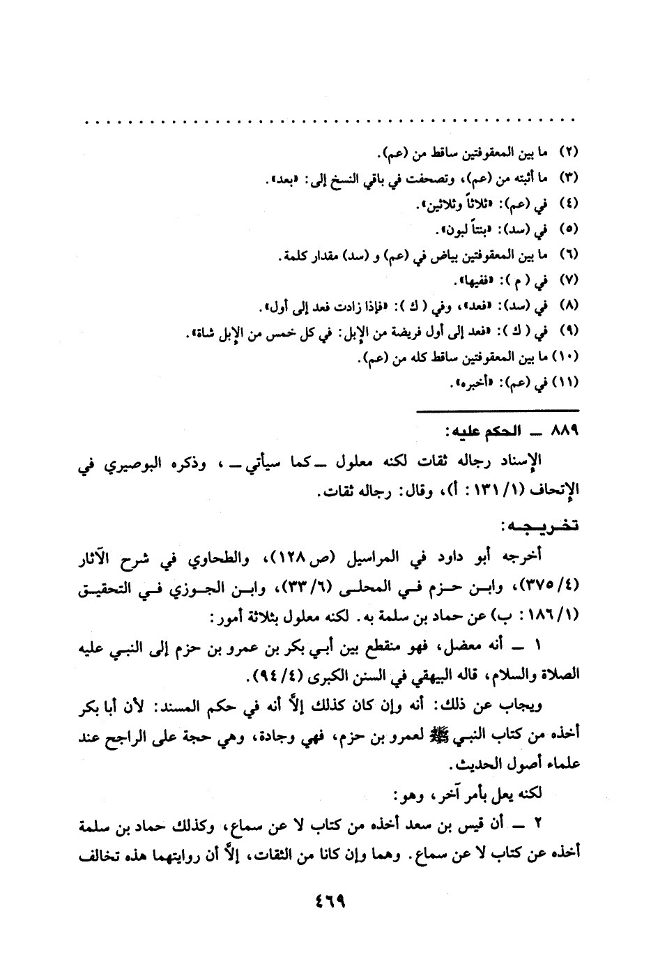 أخرجه أبو داود في المراسيل (ص 128)، والطحاوي في شرح الآثار (4/ 375)، وابن حزم في المحلى (6/ 33)، وابن الجوزي في التحقيق (1/ 186: ب) عن حماد بن سلمة به. لكنه معلول بثلاثة أمور:
