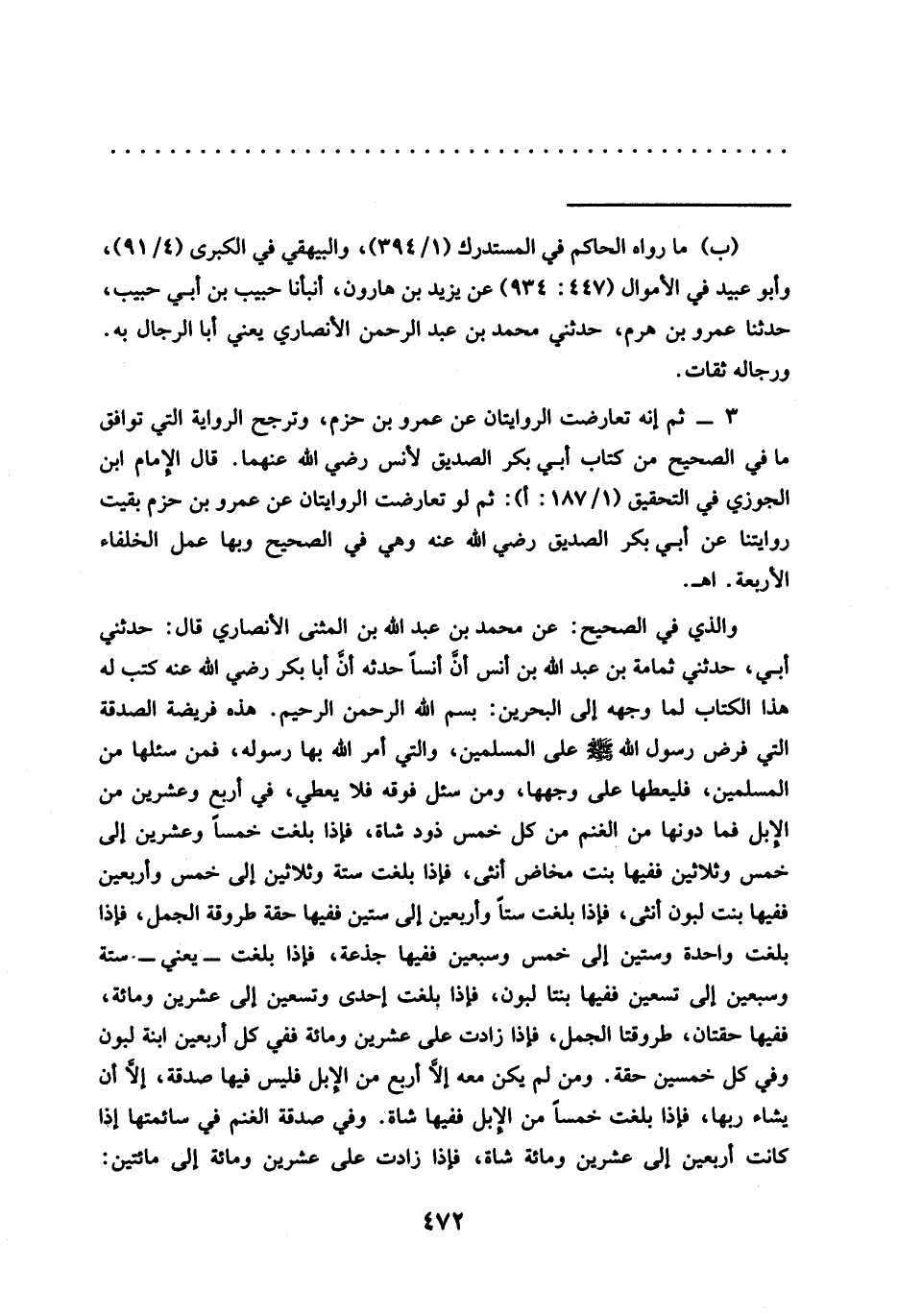 3 - ثم إنه تعارضت الروايتان عن عمرو بن حزم، وترجح الرواية التي توافق ما في الصحيح من كتاب أبي بكر الصديق لأنى رضي الله عنهما. قال الإِمام ابن الجوزي في التحقيق (1/ 187: أ): ثم لو تعارضت الروايتان عن عمرو بن حزم بقيت روايتنا عَنْ أَبِي بَكْرٍ الصِّدِّيقِ رَضِيَ اللَّهُ عَنْهُ وهي في الصحيح وبها عمل الخلفاء الأربعة. اهـ.