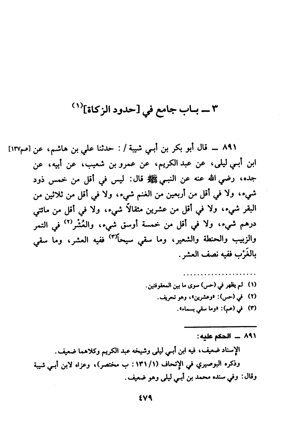 حَدَّثَنَا عَلِيُّ بْنُ هَاشِمٍ عَنِ ابْنِ أَبِي لَيْلَى عَنْ عَبْدِ الْكَرِيمِ عَنْ عَمْرِو بْنِ شُعَيْبٍ عَنْ أَبِيهِ عَنْ جَدِّهِ رَضِيَ الله عَنْهُ عَنِ النَّبِيِّ صَلَّى اللَّهُ عَلَيْهِ وَسَلَّمَ قَالَ §لَيْسَ فِي أَقَلَّ مِنْ خَمْسِ ذَوْدٍ شَيْءٌ وَلَا فِي أَقَلَّ مِنْ أَرْبَعِينَ مِنَ الْغَنَمِ شَيْءٌ وَلَا فِي أَقَلَّ مِنْ ثَلَاثِينَ مِنَ الْبَقَرِ شَيْءٌ وَلَا فِي أَقَلَّ مِنْ عِشْرِينَ مِثْقَالًا شَيْءٌ وَلَا فِي أَقَلَّ مِنْ مِائَتَيْ دِرْهَمٍ شَيْءٌ وَلَا فِي أَقَلَّ مِنْ خَمْسَةِ أَوْسُقٍ شَيْءٍ وَالْعُشْرُ فِي التَّمْرِ وَالزَّبِيبِ وَالْحِنْطَةِ وَالشَّعِيرِ وَمَا سُقِيَ سَيْحًا فَفِيهِ الْعُشْرُ وَمَا سُقِيَ بِالْغَرْبِ فَفِيهِ نِصْفُ الْعُشْرِ