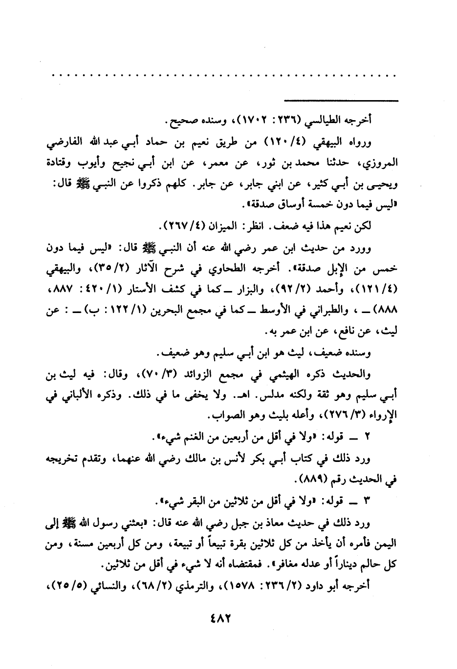وورد من حديث ابن عمر رَضِيَ اللَّهُ عَنْهُ أَنَّ النَّبِيَّ -صَلَّى اللَّهُ عليه وسلم- قال: "ليس فيما دون خمس من الإبل صدقة". أخرجه الطحاوي في شرح الآثار (2/ 35)، والبيهقي (4/ 121)، وأحمد (2/ 92)، والبزار -كما في كشف الأستار (1/ 420: 887، 888) -، والطبراني في الأوسط -كما في مجمع البحرين (1/ 122: ب) -: عَنْ لَيْثٍ، عَنْ نَافِعٍ، عَنِ ابْنِ عُمَرَ به.