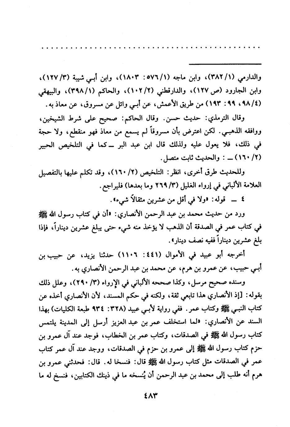 وسنده صحيح مرسل، وكذا صححه الألباني في الإرواء (3/ 290)، وعلل ذلك بقوله: [إذ الأنصاري هذا تابعي ثقة، ولكنه في حكم المسند، لأن الأنصاري أخذه عَنْ كِتَابِ النَّبِيِّ -صَلَّى اللَّهُ عَلَيْهِ وَسَلَّمَ- وكتاب عمر. ففي رواية لأبي عبيد (328: 934 طبعة الكليات) بهذا السند عن الأنصاري: "لما استخلف عمر بن عبد العزيز أرسل إلى المدينة يلتمس كِتَابُ رَسُولِ اللَّهِ -صَلَّى اللَّهُ عَلَيْهِ وَسَلَّمَ- في الصدقات، وكتاب عمر بن الخطاب، فوجد عند آل عمرو بن حزم كِتَابُ رَسُولِ اللَّهِ -صَلَّى اللَّهُ عَلَيْهِ وَسَلَّمَ- إلى عمرو بن حزم في الصدقات، ووجد عند آل عمر كتاب عمر في الصدقات مثل كِتَابُ رَسُولِ اللَّهِ -صَلَّى اللَّهُ عَلَيْهِ وَسَلَّمَ- قال: فنسخا له. قال: فحدثني عمرو بن هرم أنه طلب إلى محمد بن عبد الرحمن أن يُنسخه ما في ذينك الكتابين، فنسخ له ما=