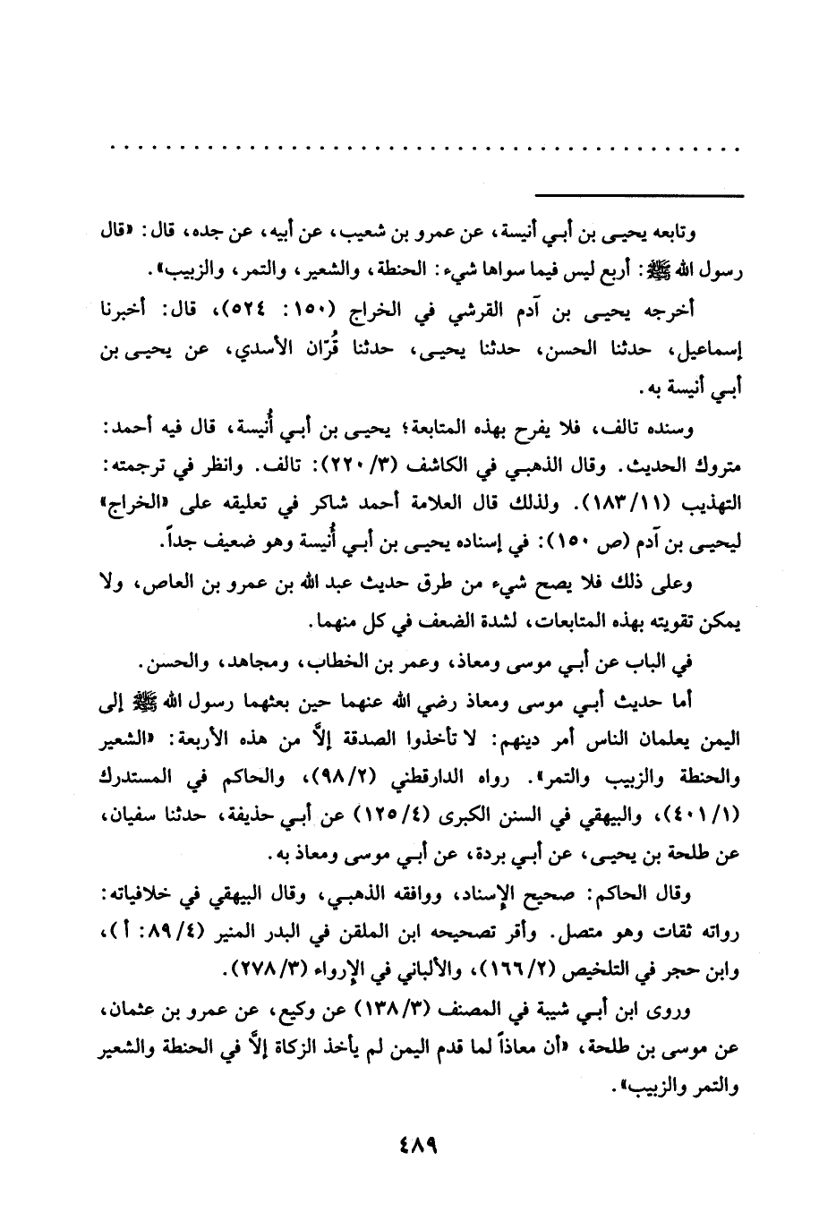 = وتابعه يحيى بن أبي أنيسة، عَنْ عَمْرِو بْنِ شُعَيْبٍ، عَنْ أَبِيهِ، عَنْ جَدِّهِ، قَالَ: "قَالَ رَسُولُ اللَّهِ -صَلَّى اللَّهُ عليه وسلم-: أربع ليس فيما سواها شيء: الحنطة، والشعير، والتمر، والزبيب".